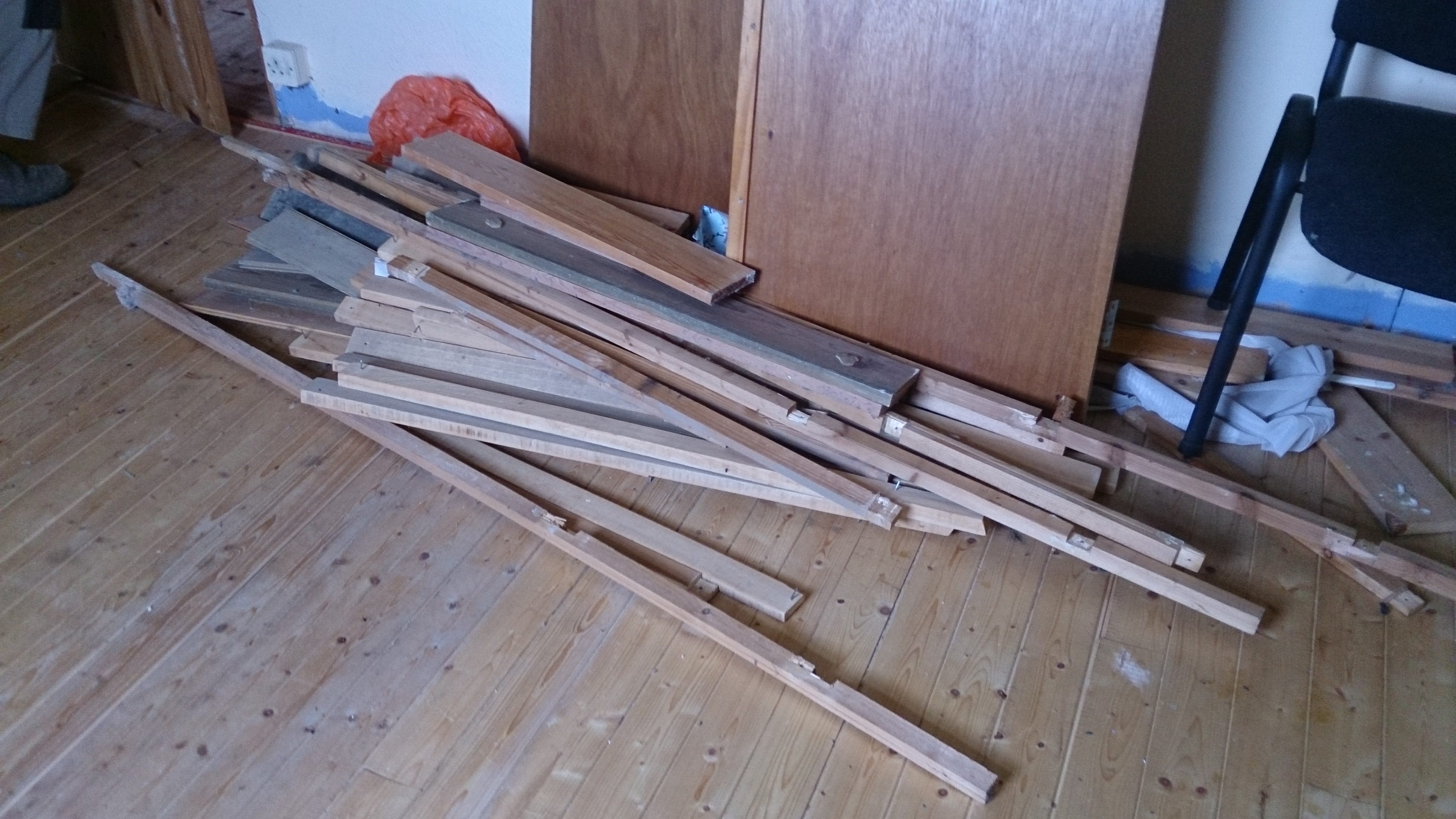 So the carpet came up, the shelving came out of the cupboard and before long we had a lovely pile of wood. As well as the door, which is quite nice. That went down to the cellar together with any wood he thought we may be able to use elsewhere. The broken/useless stuff is being piled up in the garden ready to go for a nice cheering bonfire in a friends field.