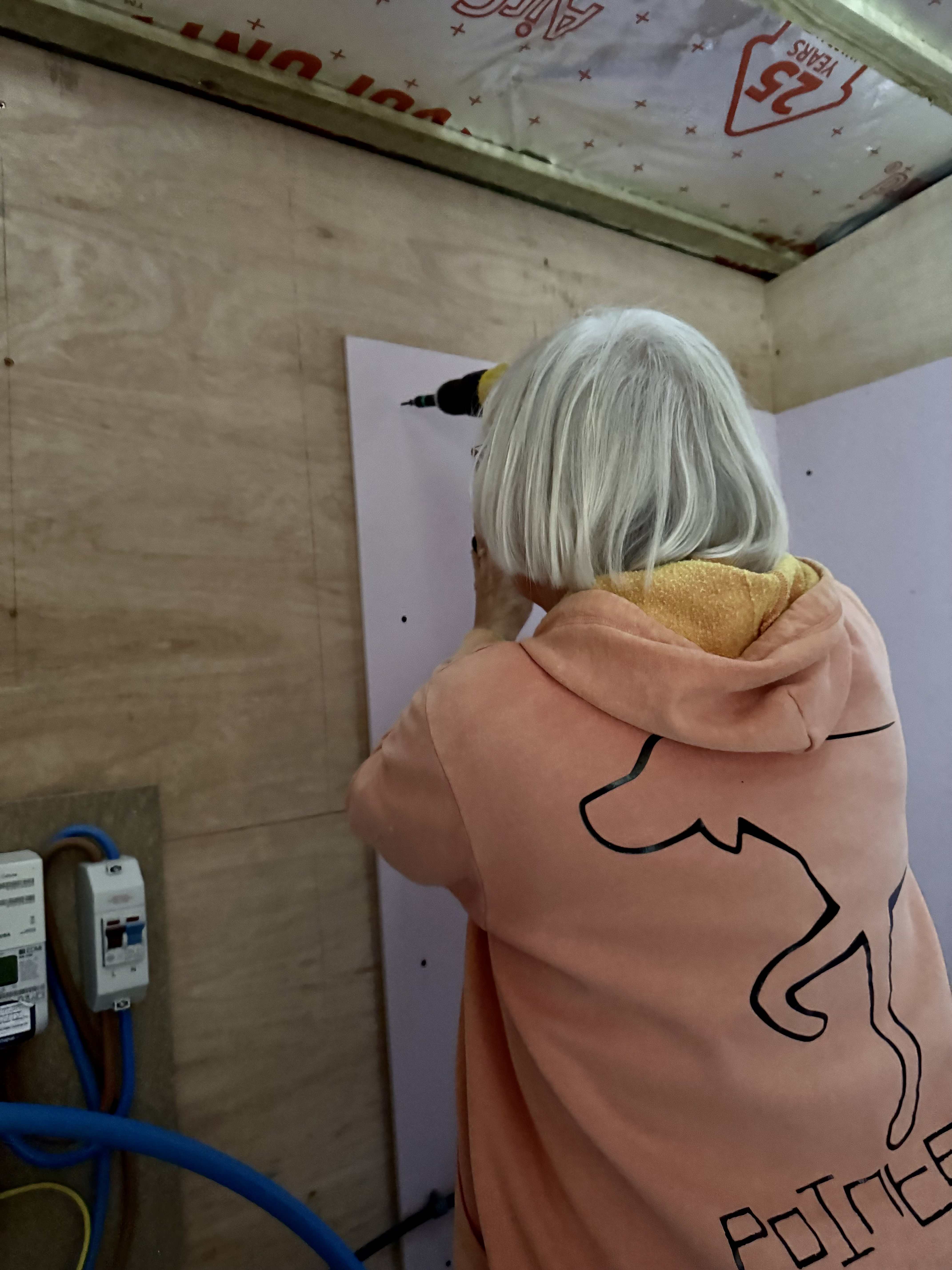No - they don't start until after 1st fix, of course, but the plant room presents a 1st fix v plasterboard conundrum - so who did we manage to rope in for some impromptu 'boarding out'? Why, none other than Mrs P! Seen here in action: