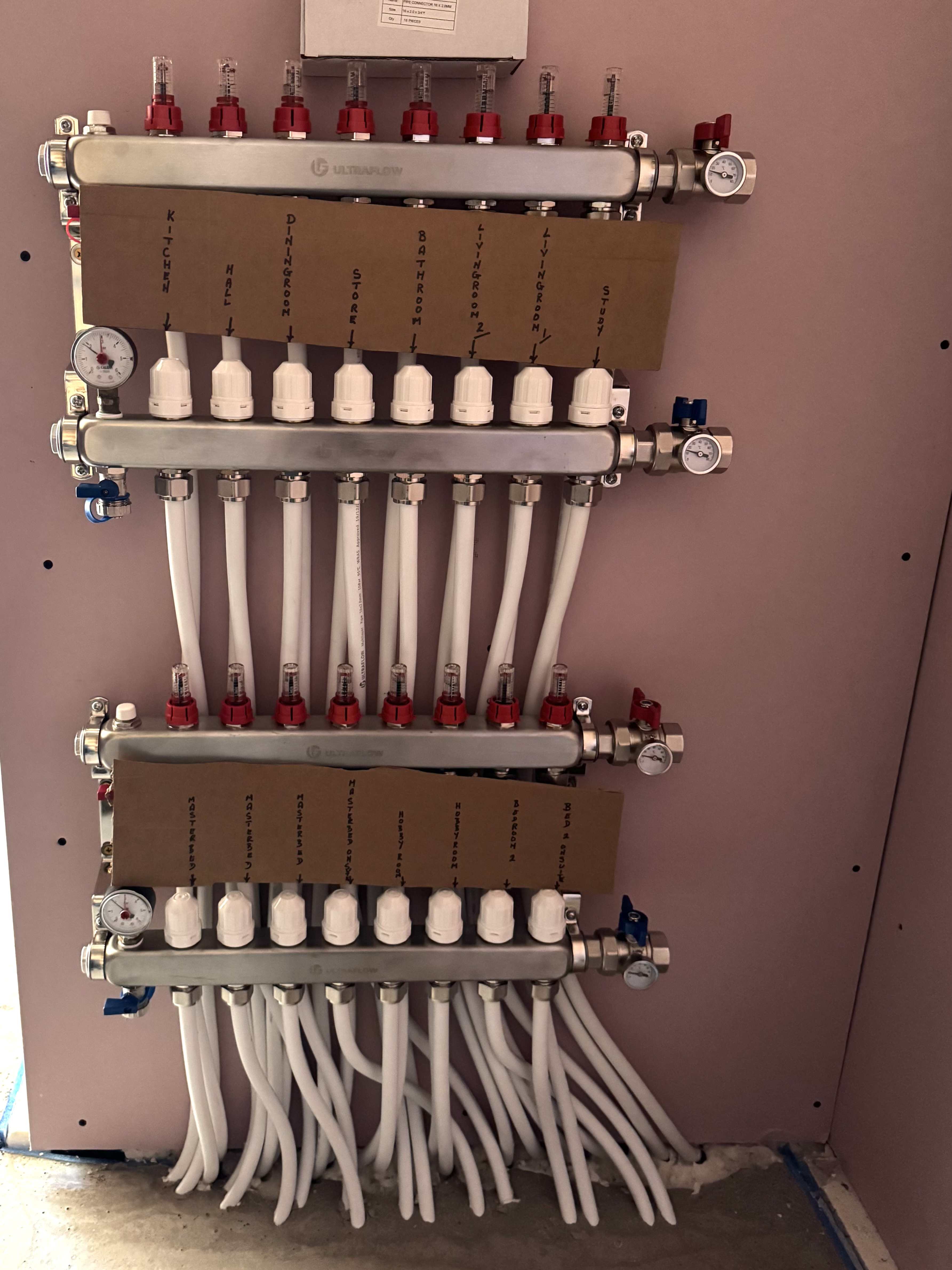 Last week's drama getting the UFH pipes laid just in time for the screed pour seems like a distant memory but as there had not been time for Ken to fit the manifold and pressure test, he came on site on Sunday evening (roping in his Dad as a helper) to get that done.