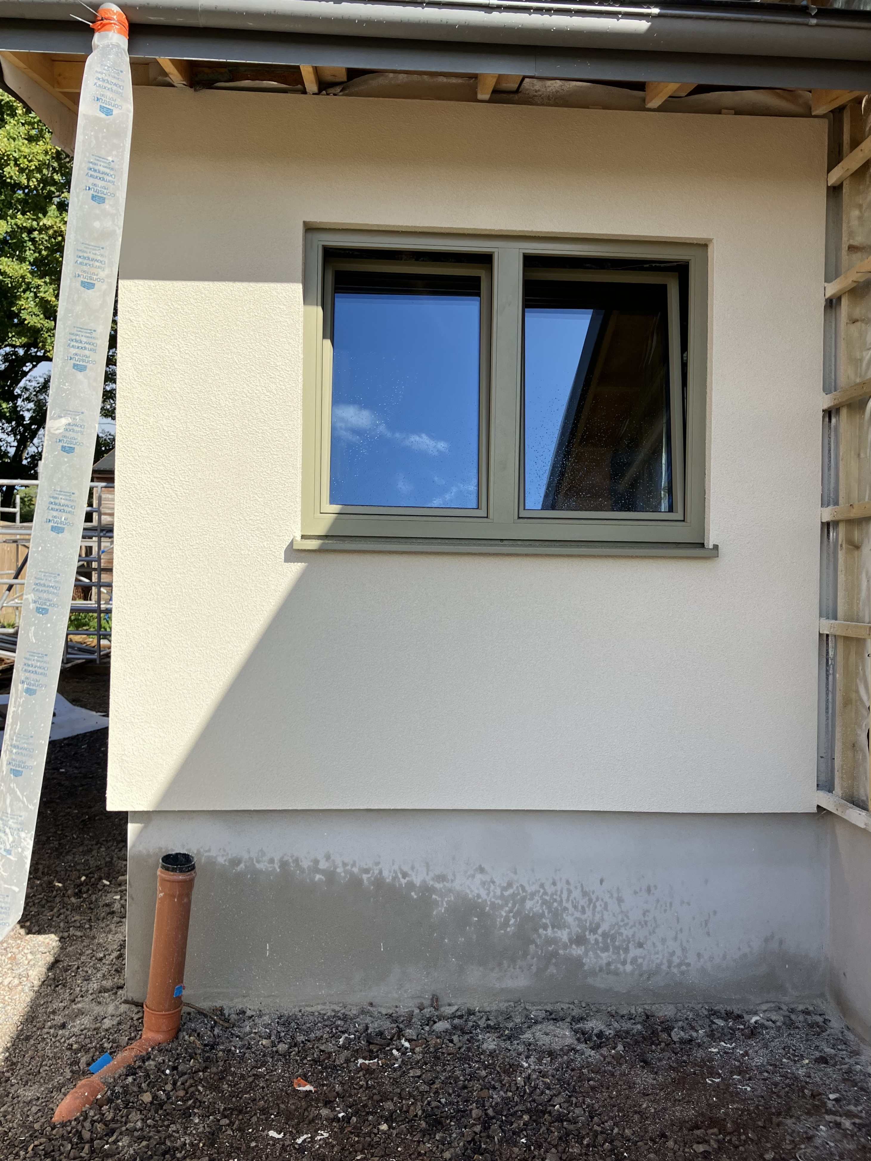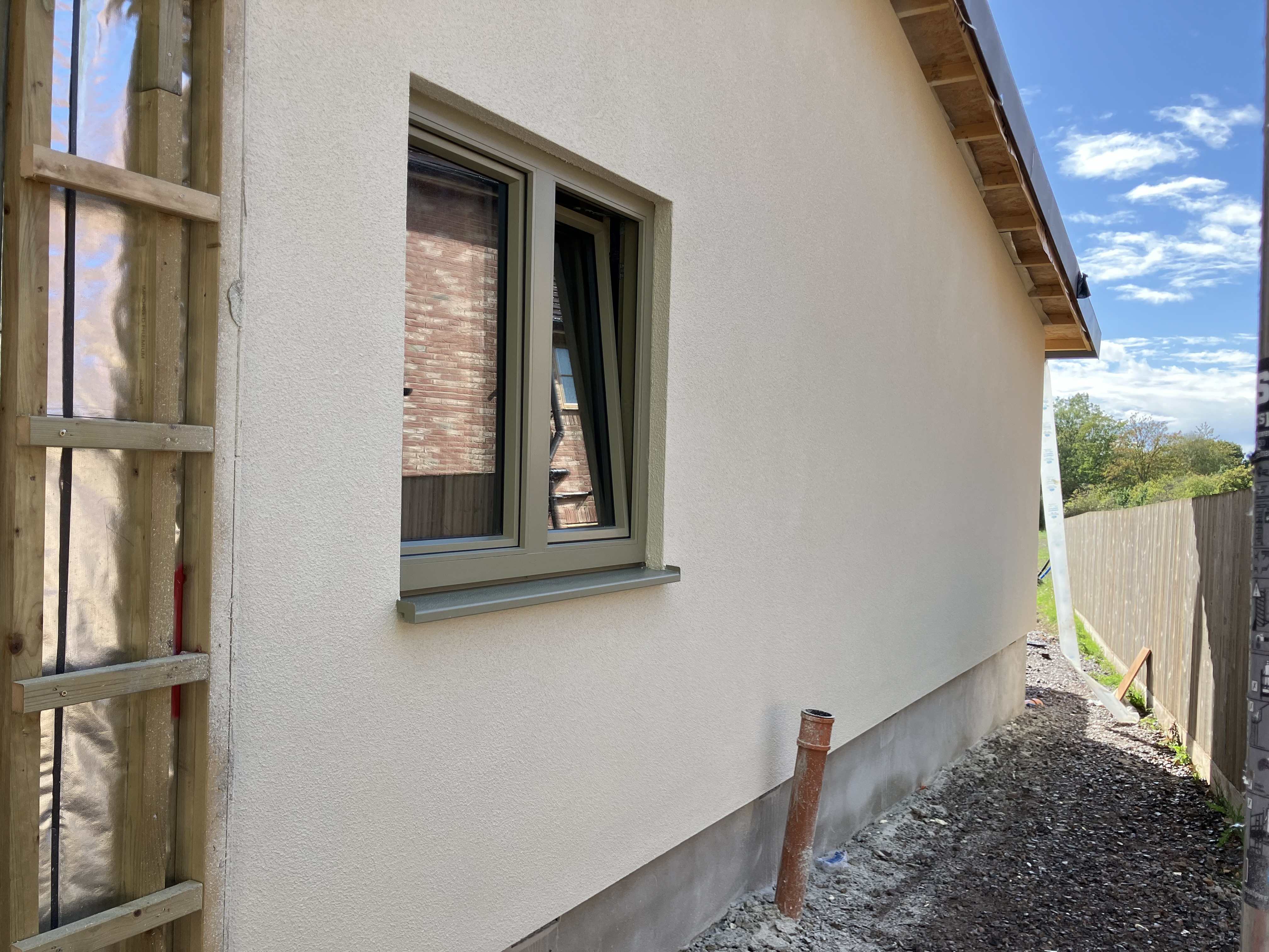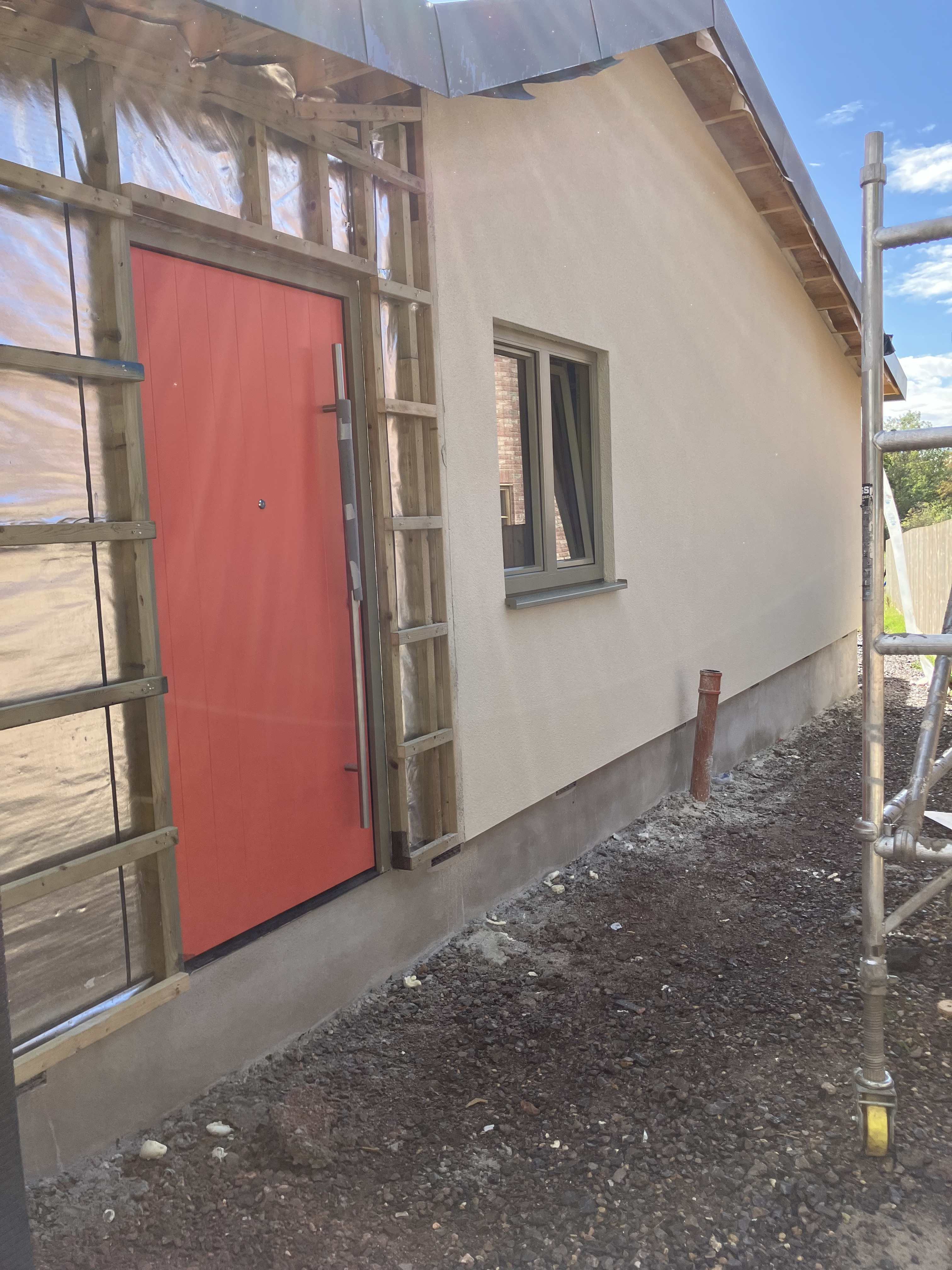 Although the weather has been 'iffy' at best John Wheeler from Caesar Spray-Rend managed to find a window to prime our base coat and then spray the Ecorend Thin Coat topcoat in 'Scotch Stone'. Again, we're very pleased with the result. Once the timber cladding goes on the other sections (later, later!) we think the two finishes will work really well together.