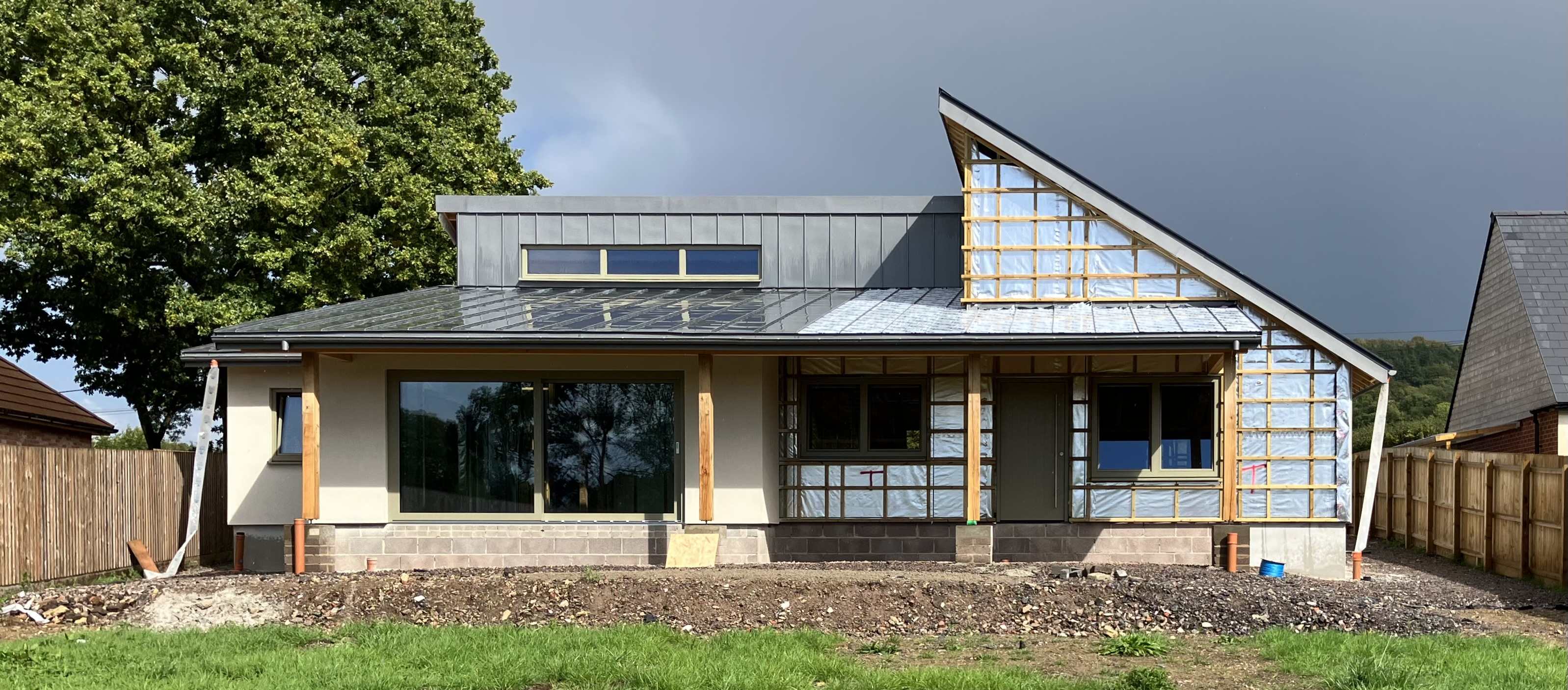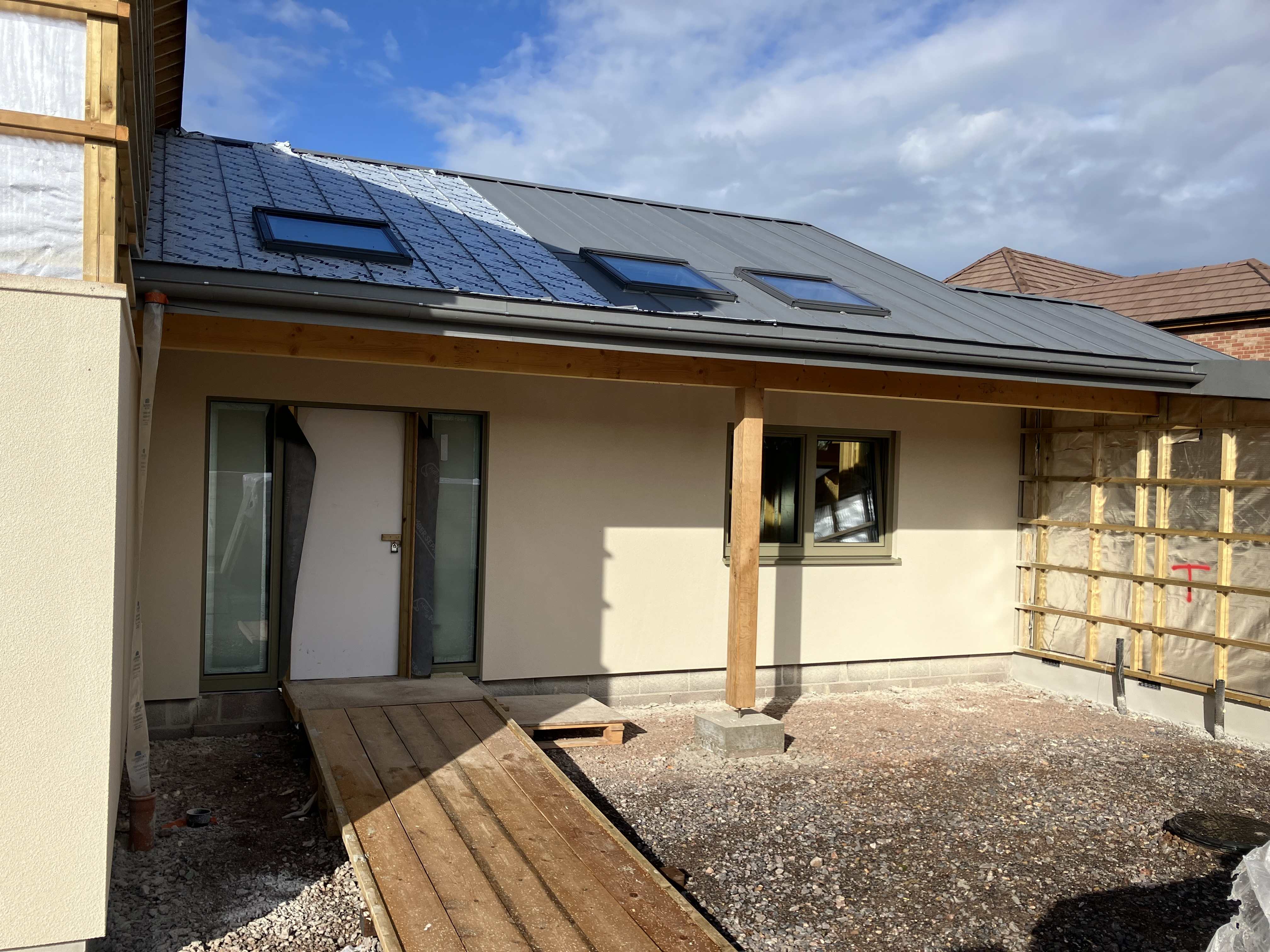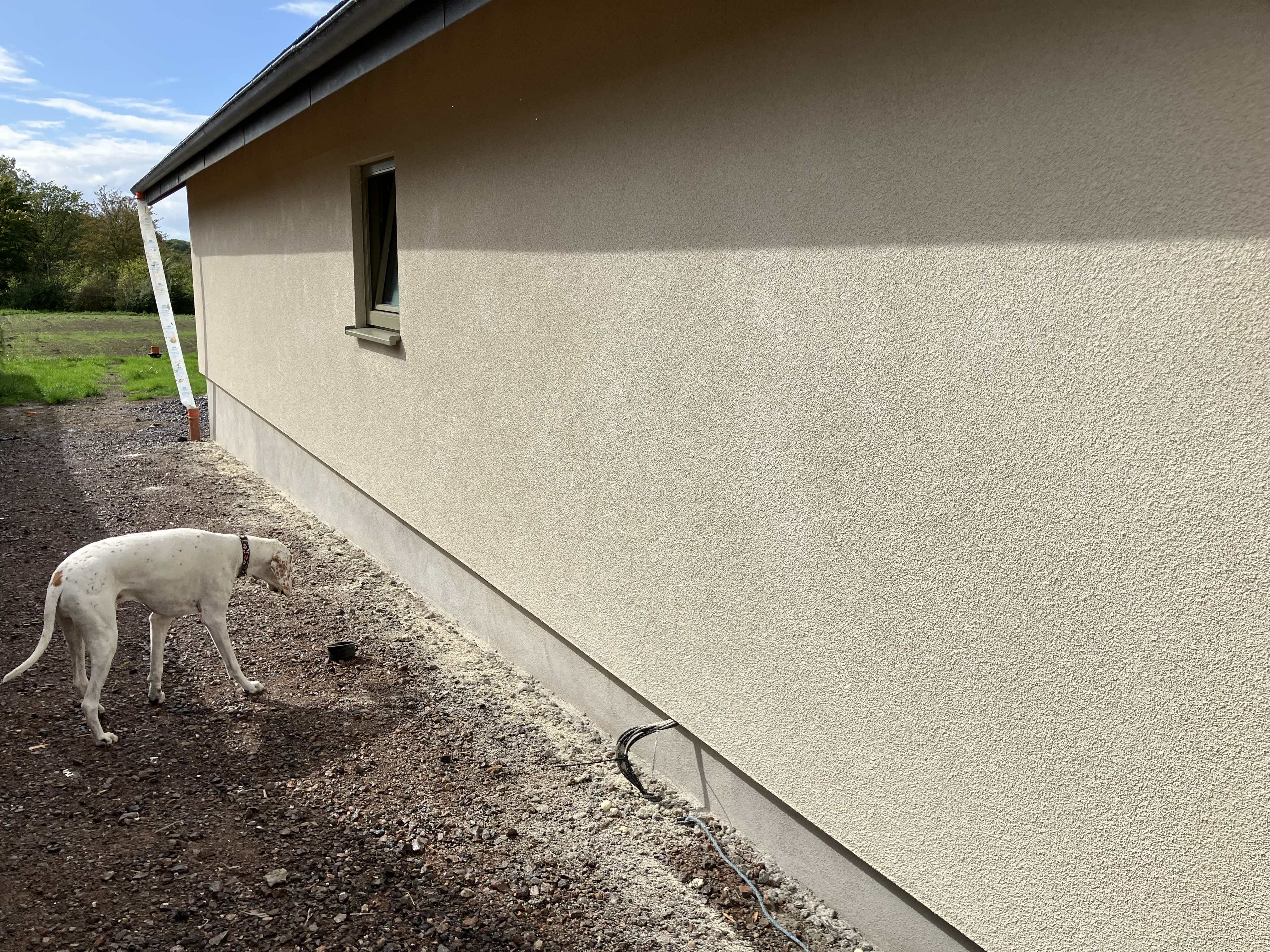 Although the weather has been 'iffy' at best John Wheeler from Caesar Spray-Rend managed to find a window to prime our base coat and then spray the Ecorend Thin Coat topcoat in 'Scotch Stone'. Again, we're very pleased with the result. Once the timber cladding goes on the other sections (later, later!) we think the two finishes will work really well together.