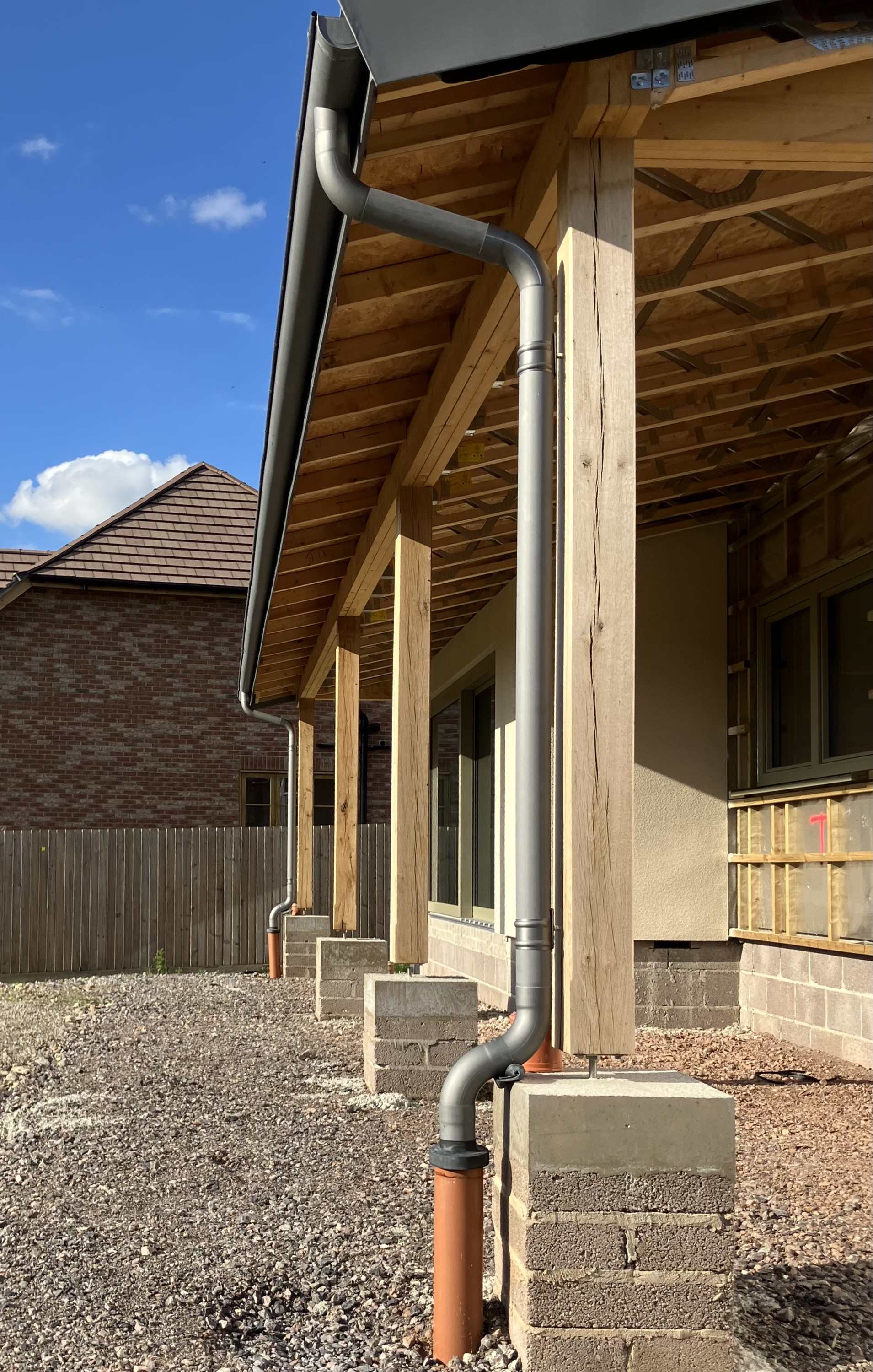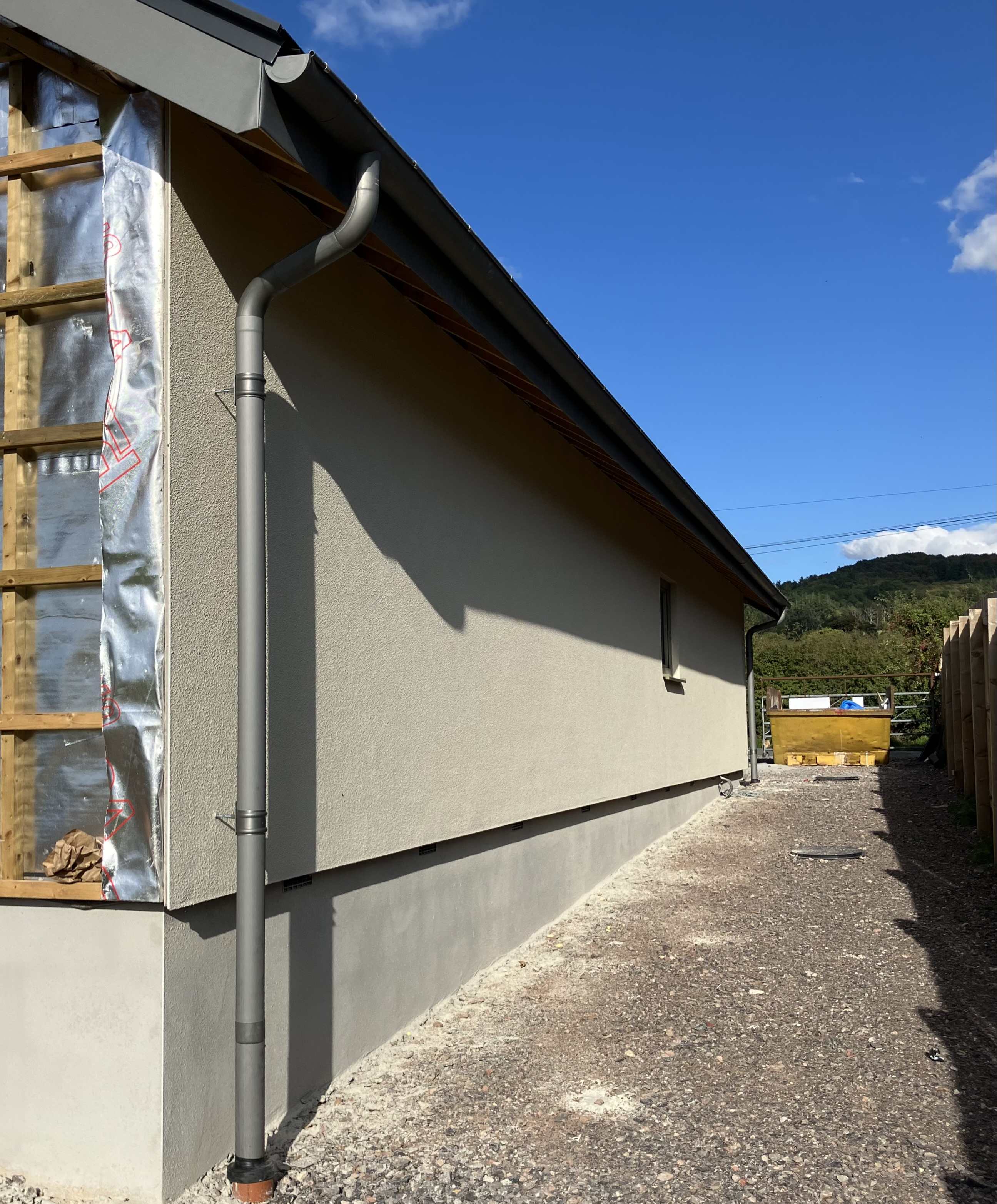 Well, so did we. And now the render is dry, Tom from Wessex Metal Roofing came back to fit the down pies and remove the remaining plastic protection. We really like the roof.