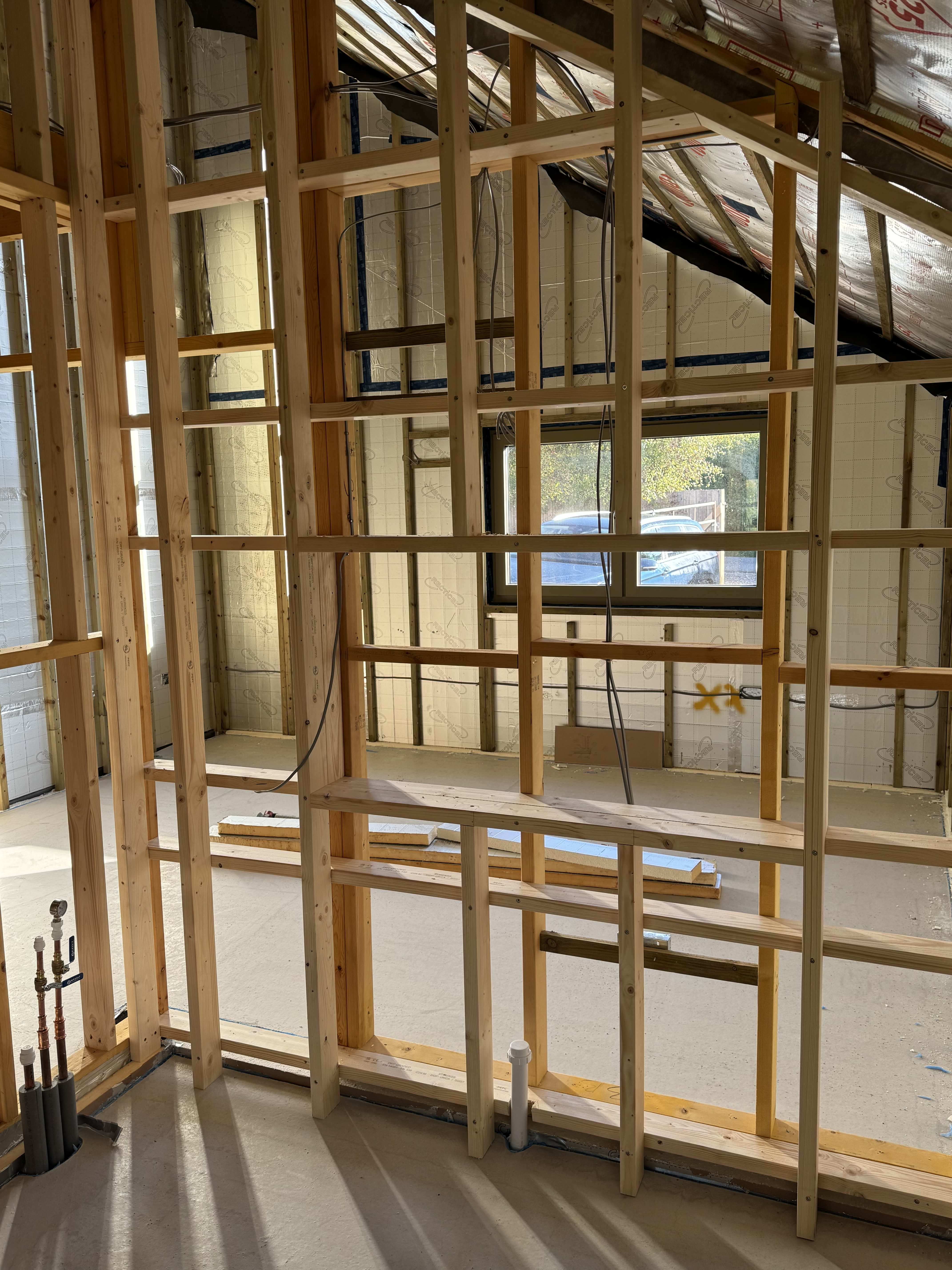 We’ve got a surprisingly long list of jobs that need to be done by Alan and Chris our chippies, including wall and ceiling battening, walls and ceiling studwork to create space for ventilation ducts and plumbing, pocket door frames. A bout of covid has put them behind schedule but they still seem (reasonably) confident they can be ready for the plasterers.