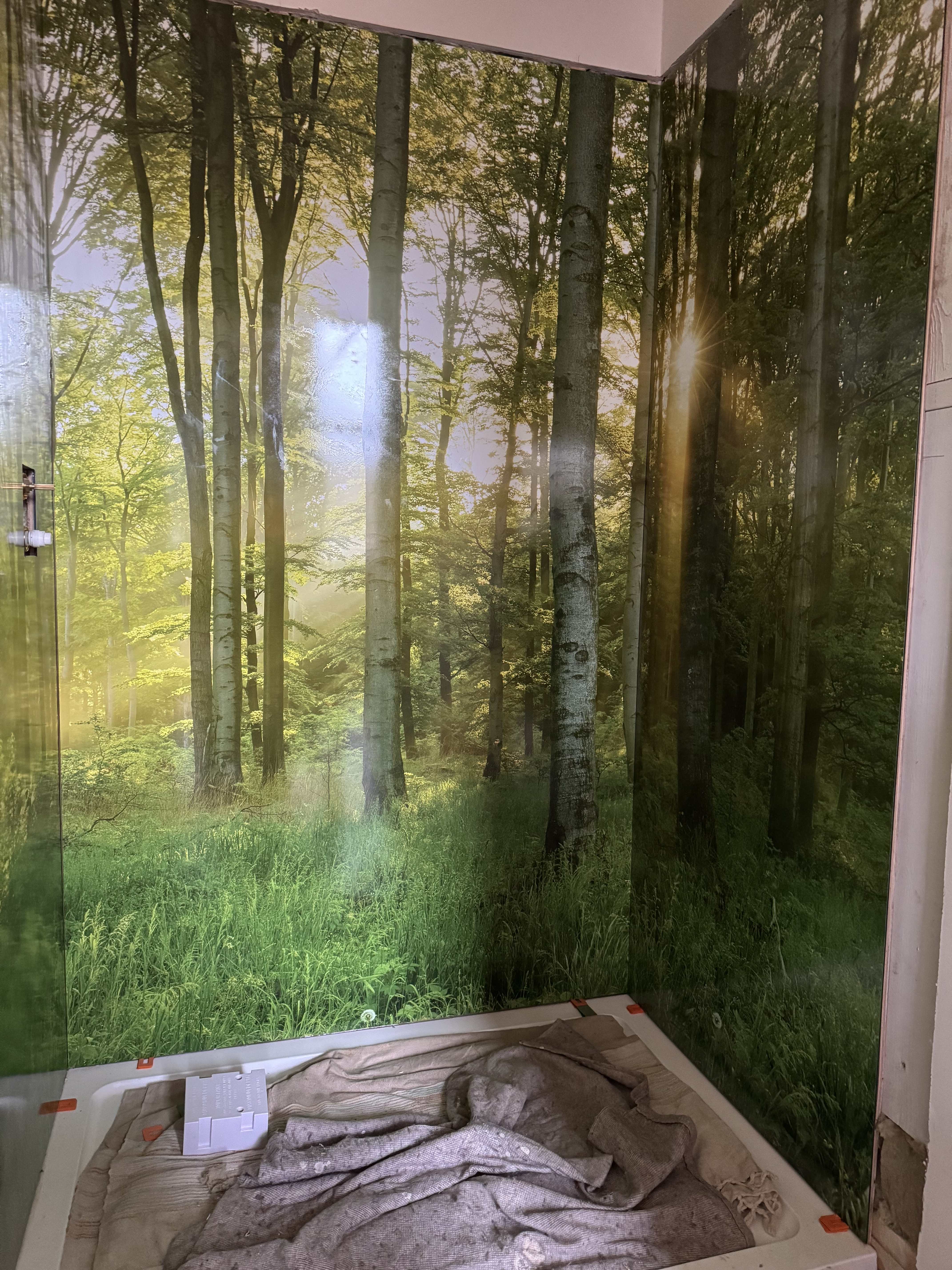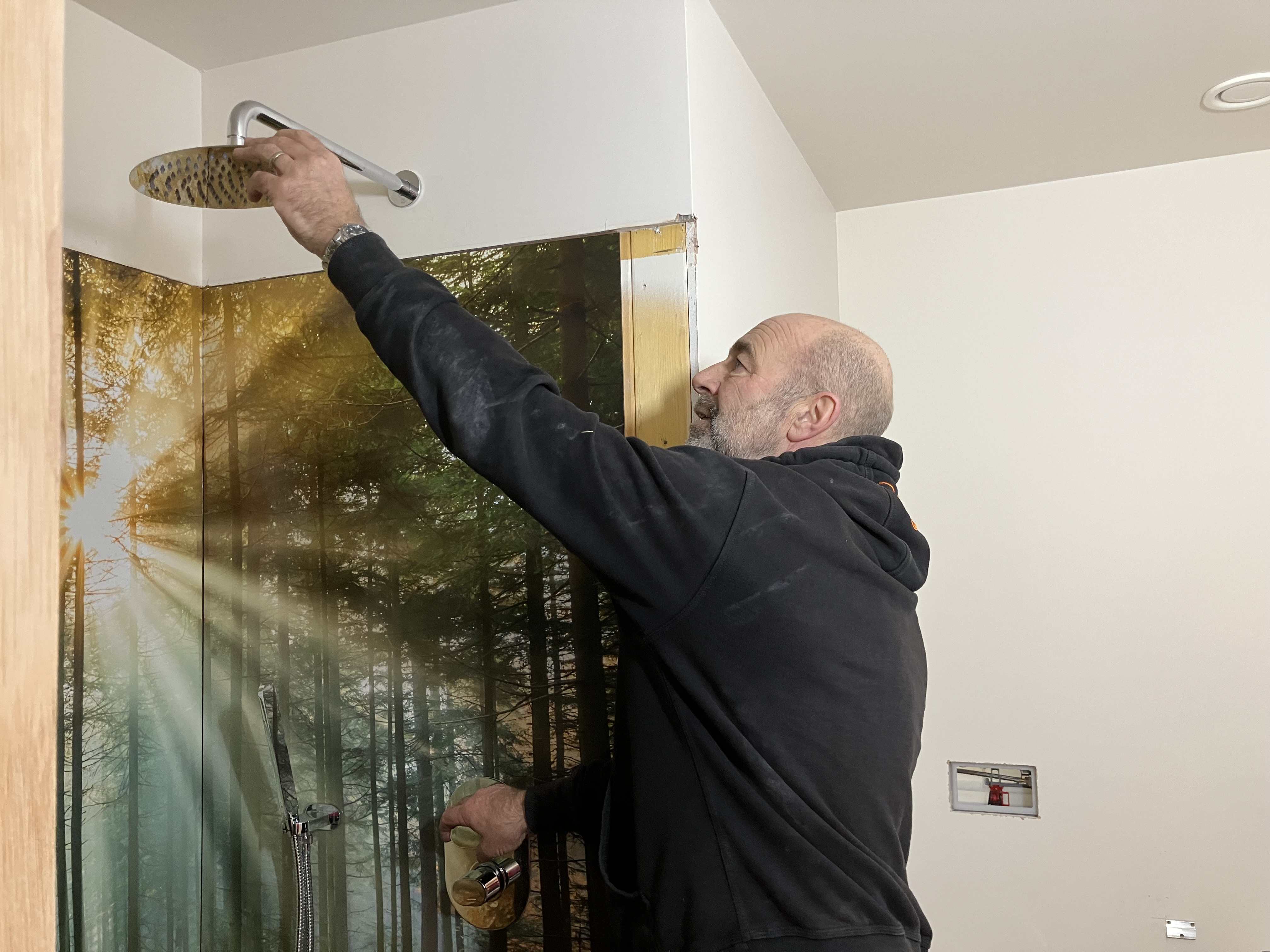 Chris has made great progress so far and we are particularly pleased with the mural wall panels that he’s fitted to the two showers. He’s also sorted out half a dozen minor jobs in the plant room, and set up the supplies and waste for the kitchen and utility rooms.