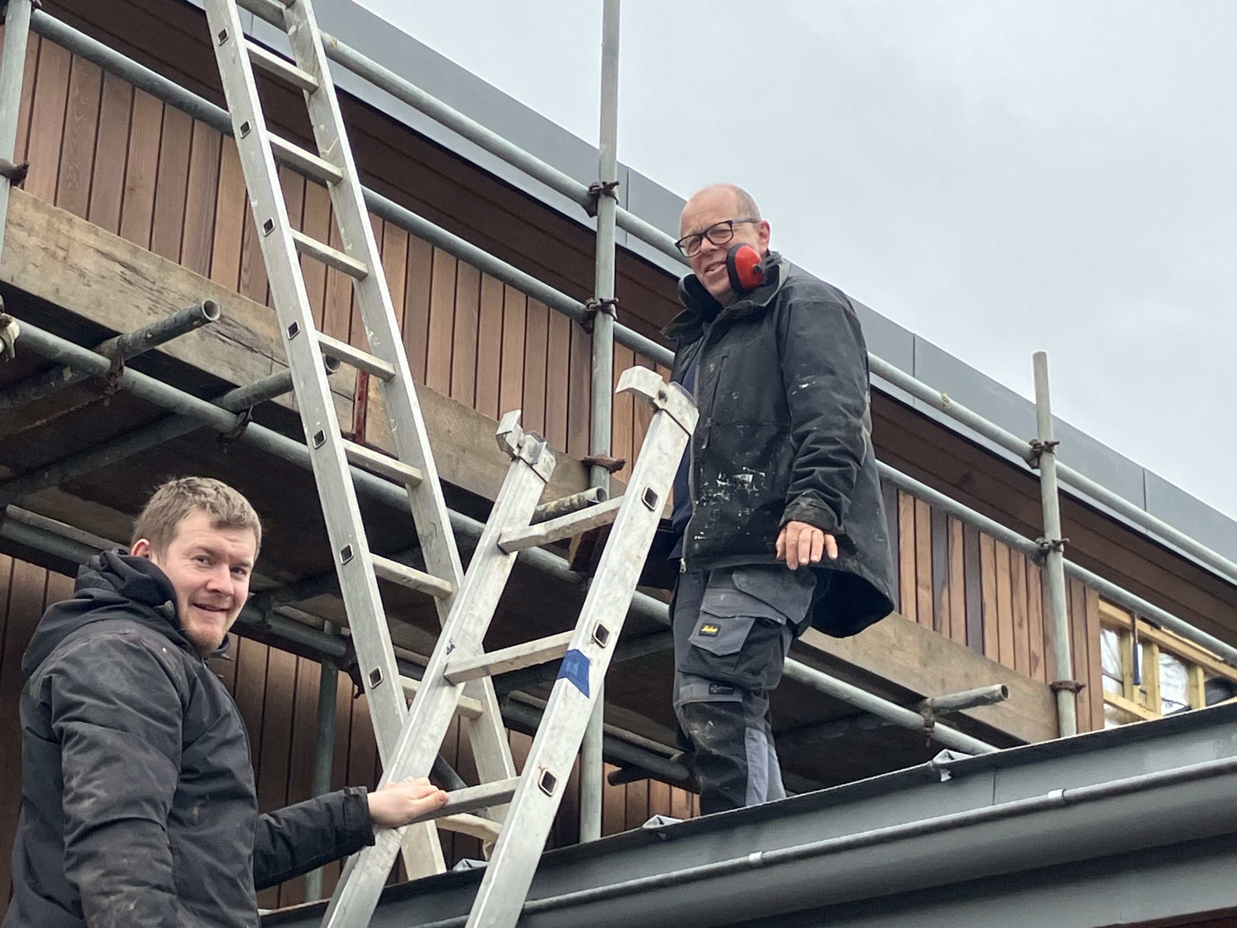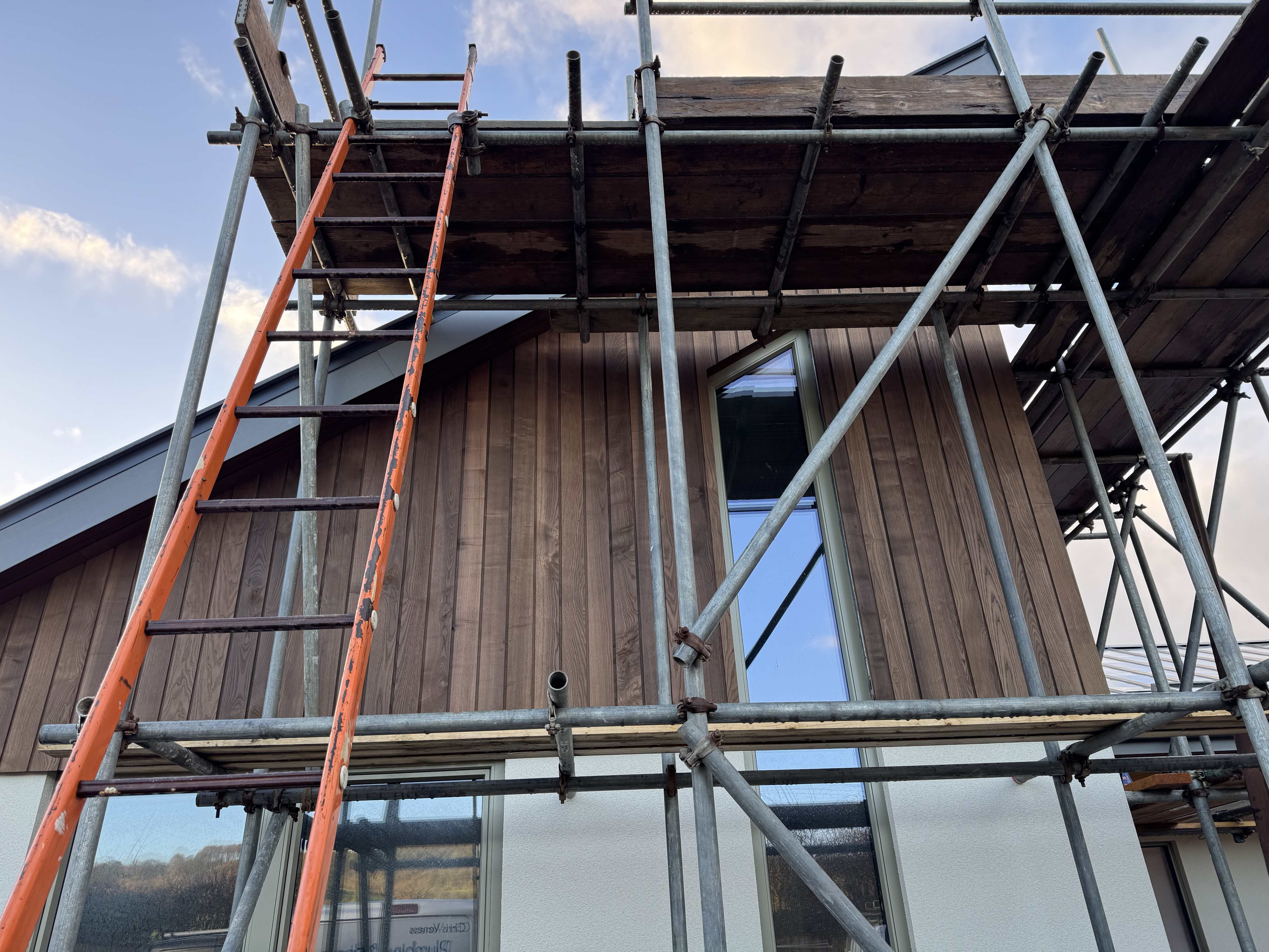Alan and Chris, our two chippies who have been with us throughout the build have been progressing the Brimstone Ash cladding. They’ve made a great job of it too. All the high work is now done and so our scaffolding should be coming down within the next week or so, with luck. It would be nice to get the house clear of scaffolding with the cladding complete before Christmas.