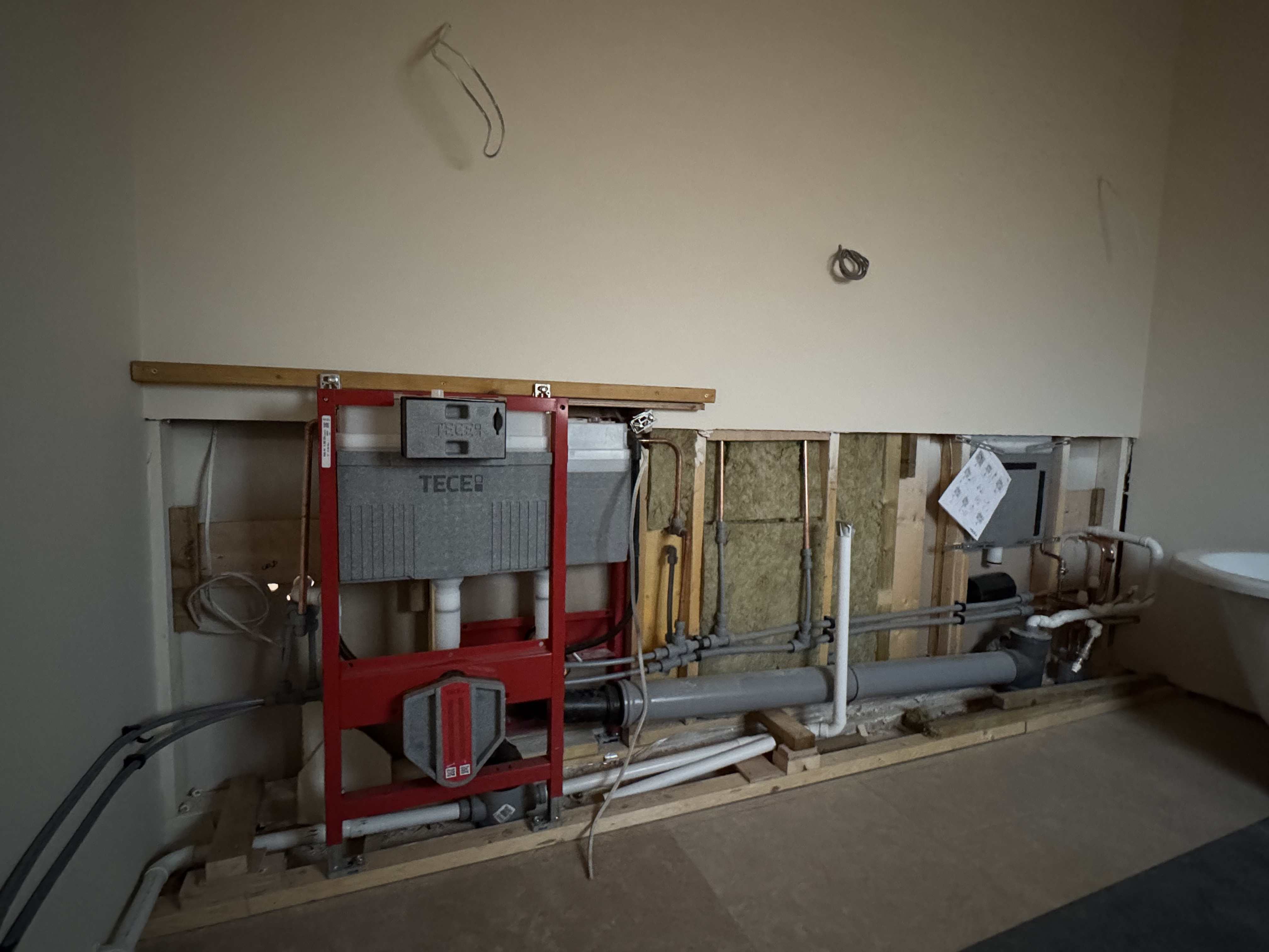 We are trying to maximise the space by fitting a generous master ensuite, a family shower room, and a guest ensuite into a relatively compact area of the overall house footprint. This means a lot of plumbing has to go into the wall between the master ensuite and the other two bathrooms. The soil pipes, whose location we had decided on during groundworks, proved not to be in the ideal place, but Chris managed to find a way to make it all fit. We dropped one wall hung WC in favour of a back-to-wall, floor-standing model with a concealed cistern because there was simply no way to fit a wall frame into the studwork and line the soil pipe up.