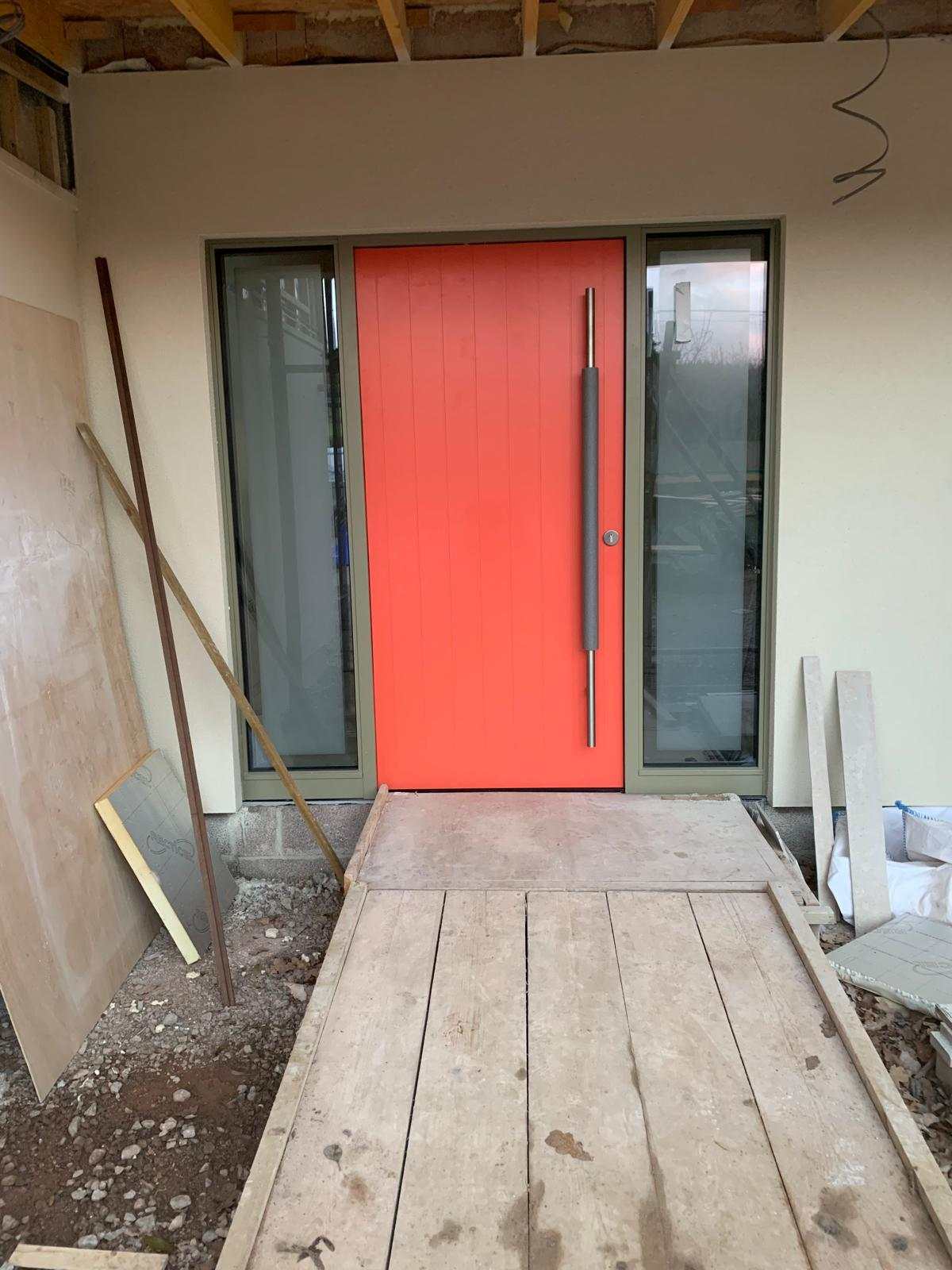 Between cladding, they found time to fit the 'real' front door back on (Norrsken tip was to replace it with a temporary door while the 'messy' trades were in and out of the house.) The door looks great - but I am not sure the pipe insulation on the handle adds much to the aesthetics.