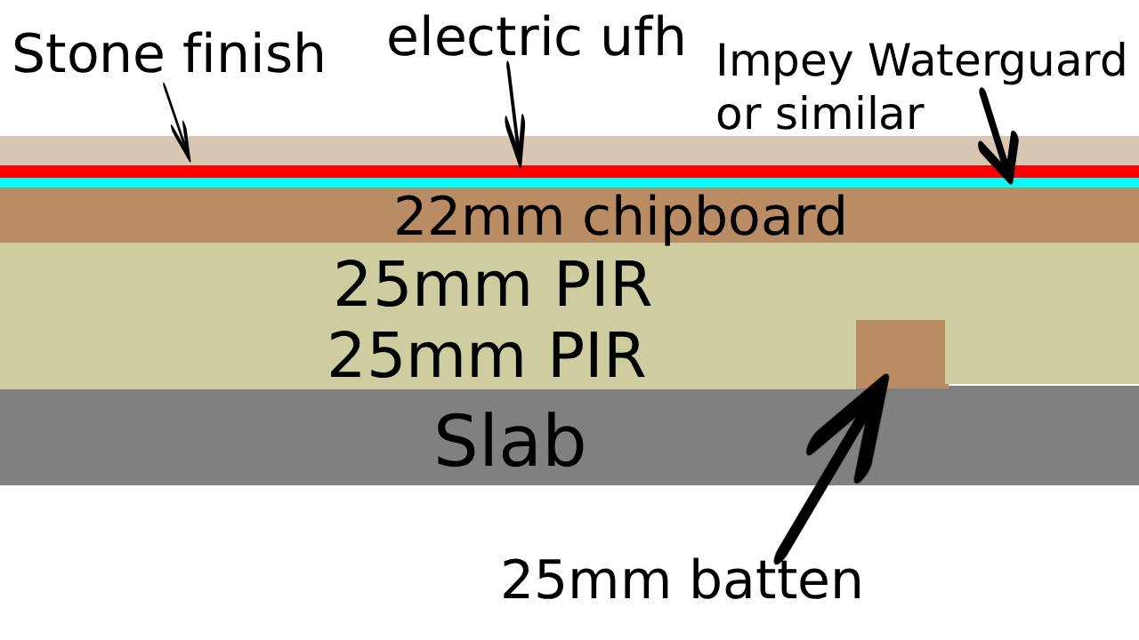 Hello - I was wondering if you'd be able to sense-check my floating floor plan, please? The wetroom is just a corner of the bedroom, about 3.7sqm. In the bedroom, I'll be putting 50mm PIR on the slab, topped with 22mm chipboard. For the wetroom floor, I therefore thought I'd do the same, then topped with impey waterguard, electric ufh, and natural stone. To help with stability on the floating floor, I thought I could add a perimeter of battens like in the picture below, and screw the chipboard into it: Does this sound like a plan? Thank you.