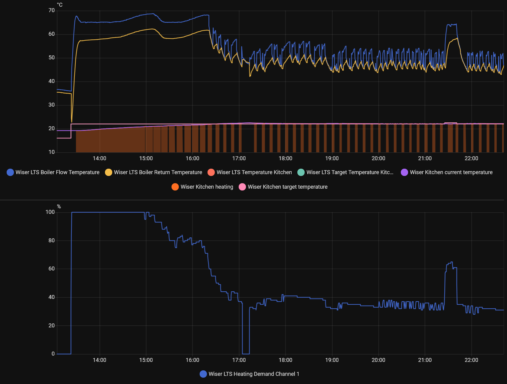 Since yesterday, I've opened up various valves, the two most distant radiators fully open, and opened the towel rails a bit. The system manages very long burns if allowed a higher temperature and it's not close to set point, but as it gets close to set point it drops the temperature and cycles more. By staring at the Home Assistant graphs, I'm still seeing some very short cycles but a lot of them I can connect to Wiser demand changing mid flow (which seems like a bad design from them). BTW I do have it set up as Oil boiler, which should limit things to 3 cycles per hour, but obviously getting a lot more than that.