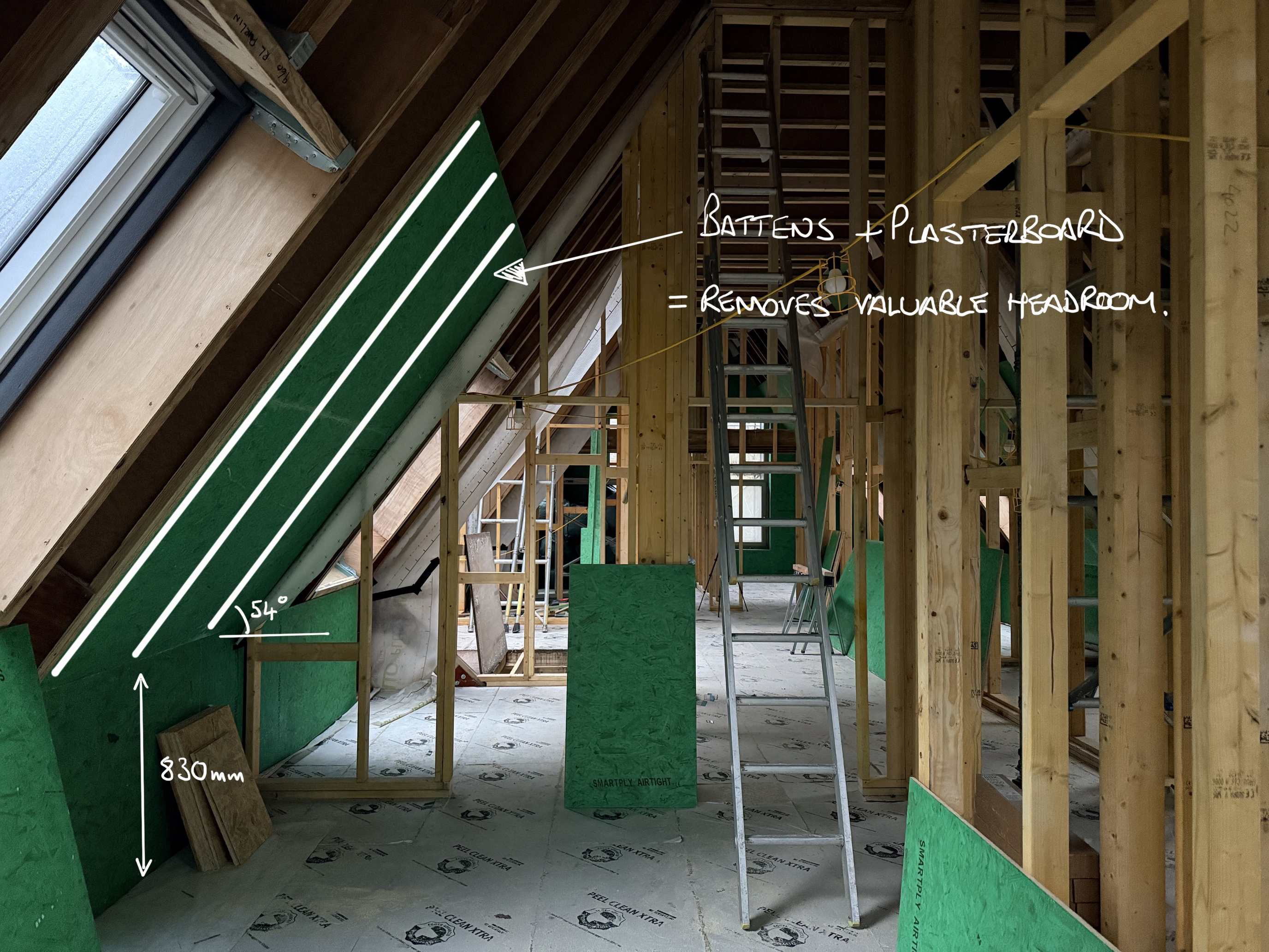 The entire upstairs is within the roof void. We have a steep pitch and a short wall height before the steep pitch starts. Having reviewed our lighting and power plans, we have no need for a service void on the sloped ceiling, and losing 37.5mm for the sake of it would be noticeable to the headroom and useable space in the room. I’m wanting a sanity check - is there anything I’m missing? The sloped roof will be all boarded with airtight pro passive board, and I would assume we would screw the plasterboard to it as ‘normal’ (should we be aware of / consider any other way?) Thanks