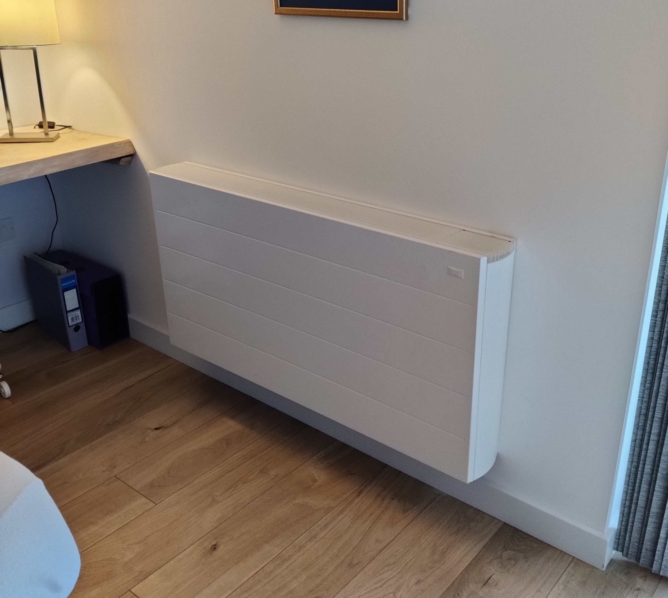 https://coolenergyshop.com/collections/radiators-fan-coils?srsltid=AfmBOoo2Jwpa28-xTPSwQCmxyskK6onq3GBoEW004T_AV7JvfWtJQvZo Here are a couple of photos of ours which heats a summer house (a Myson unit). First is the unit without the cover installed, controller is on the right, a finned radiator panel behind the sheet metal and a linear fan below it. It basically modulates the fan speed to maintain a a set room temp. Way smaller than an equivalent radiator.