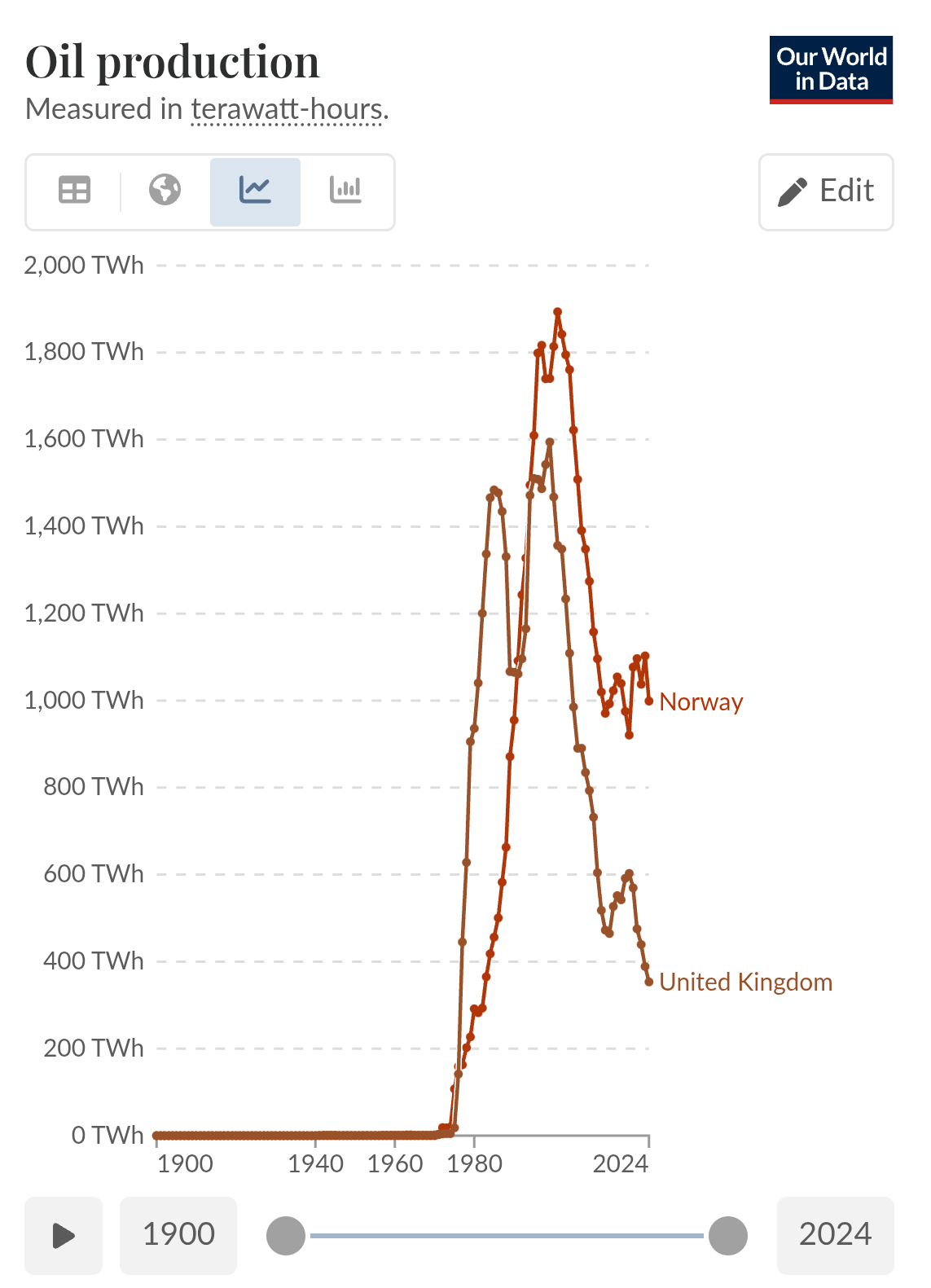 What that graph doesn't capture is the price of the oil extracted and the rate of extraction. The amount of oil you can extract *economically* changes with the price of oil. As oil prices rise, less attractive sources become viable. Canada has one of the world's largest reserves, but as tar sands which are very costly to extract. The clst per barrel is somewhere north of $60 a barrel, whilst Saudi Arabia is below $10. So if the world price is $100 Canada has huge reserves If it's below $50 it has very little. The UK has already picked the low hanging fruit. The remaining reserves are in more costly places to extract. I have looked and I cannot find a single reputable source who says that the UK can achive energy security through fossil fuels. Can anyone find one? (politicians don't count)