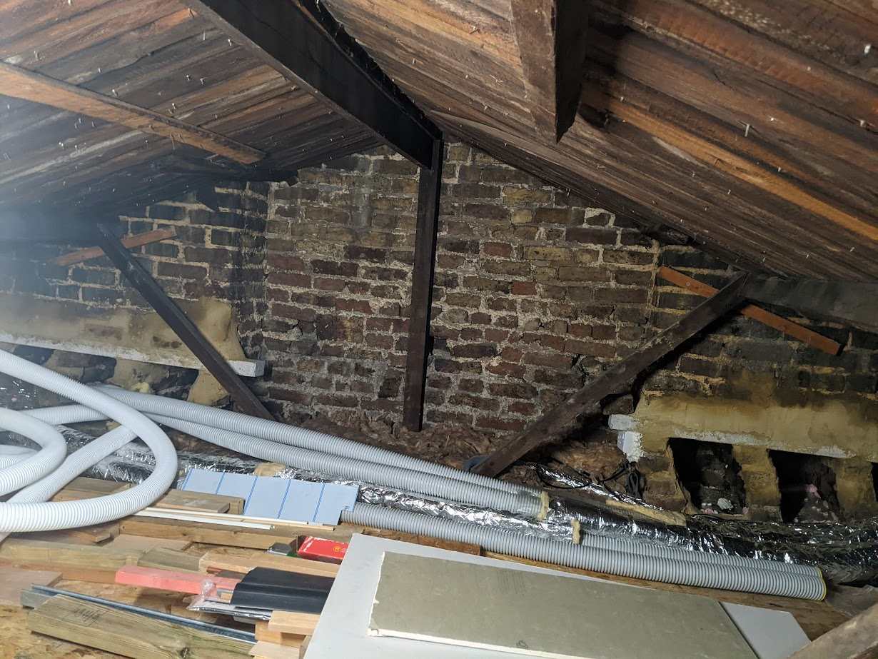 I started a DIY MVHR build as I wanted to make my house a bit more insulated, but already have condensation on windows and smells that linger for says, so it seemed like a sensible next step. My attic is cold, but the only place I really have space for a unit, and figured I could insulate the chimneys at the same time as passing MVHR pipes down them (after putting in a lintel) - 3 chimneys front and 3 at the back for a 3 story mid-terrace house of ~140sqm. The chimneys are pretty warm now I have insulated them at the attic (no external walls), and added small breather vents into the house. I have mostly insulated the ducting in the chimney and will of course do the same in the attic once I have finalised manifold locations, and probably the MVHR itself given it's a cold attic. There are some rooms I still need to work out the semi-rigid duct path (no chimney to use for several rooms), but Im starting to think about next steps and would love to hear your thoughts/concerns please? Im planning to put the MVHR in the middle of the chimneys, and the semi-rigid ducting can all meet at some manifolds there quite easily. Do you think it would be best to wall mount with some brackets, or just put some wooden joists to support its base? If I put the external vents through the chimney then there will be a lot of bends to deal with (around the roof supports and going down to the opening for the chimney before going up the chimney to some form of cowl). Would I need a drain point at the bottom of this ductwork, or is it generally ok so long as the ductwork is insulated? My alternative is to ask a roofer to cut a hole in my roof and put the external vents directly above the MVHR (and could then totally remove chimney at some point - given I think I can see water marks on the chimney above the lintel it presumably needs some work anyway). Is this worthwhile do you think? (shorter pipework but more invasive and risky to interfere with the roof, given somebody in the past made the strange decision to add planks added on the back of the roof) A Zehnder Q350 is an impossible squeeze through my roof hatch at present, but I may cut the hatch just to allow entry and then re-seal... Though definite effort! Alternative options with a width <510mm seem to sacrifice a fair bit. The Zehnder needs 160mm vents, but if I used 200mm vents could I use flexi pipework to make the routing easier (due to the above), or would I need more like 250mm to compensate for all the ridges....? (the chimneys are about 240mm wide, but quite sooty, so definitely needs lining) Any thoughts or feedback very much welcome, thanks in advance!