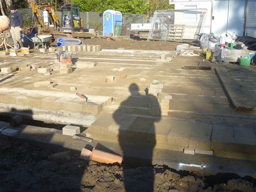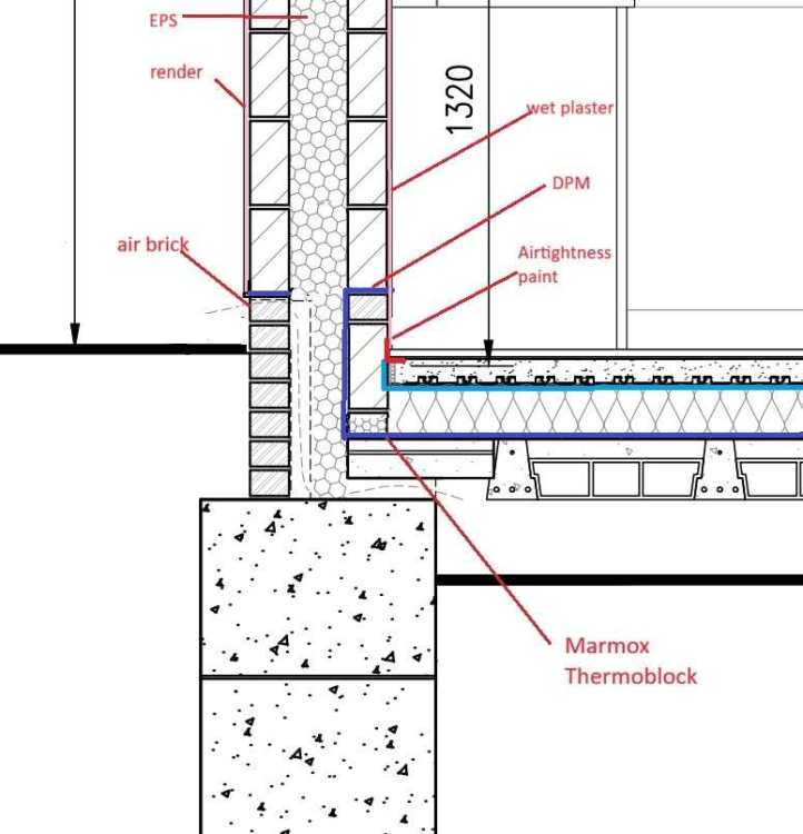 Thanks for your input @Gus Potter. When I say, “I designed the house.”, I mean, I did all the planning permission drawings & passed these over to an architectural technician, together with some notes about materials & build method (the Thermoblocks were part of my spec’). The AT has done the drawings my detail drawing was taken from, above. I expected him to do a lot better than this. Now I am spending hours & hours teaching him how to do his job properly so he can improve the drawings before they go to building control. My intention was to have EPS beads filling the cavity, with these going all the way down to the trench blocks. I imagined the EPS installer would drill through the inside leaf near the floor to fill the area below the tray. If I don’t need a tray & I can have two separate DPCs that would seem to me to be a better solution. This was suggested to me on an earlier thread, but I thought the 2 separate DPCs suggestion was just for below my windows. If we can use 2 separate DPCs the whole way round the house, that would be great. Are you sure omitting the Marmox blocks is a good idea? This is going to mean all my walls will be sucking heat out of the house straight into the ground. I can’t follow @Iceverge’s detail above (thanks for putting this up, @Iceverge) because I’m building my inner leaf off the top of the B&B, which has already been built. Here’s a picture of it during construction. As discussed here previously, the cowboy builder sat the B&B on trench blocks, instead of on dense blocks (which were on the drawing), so there’s no cavity beneath the level of the B&B, & although he put the beam ends on DPC, he then bridged the DPC with mortar - see below. The bit on the right of the picture, with the light coloured slips, is where the air brick periscope feeds air into the B&B void.