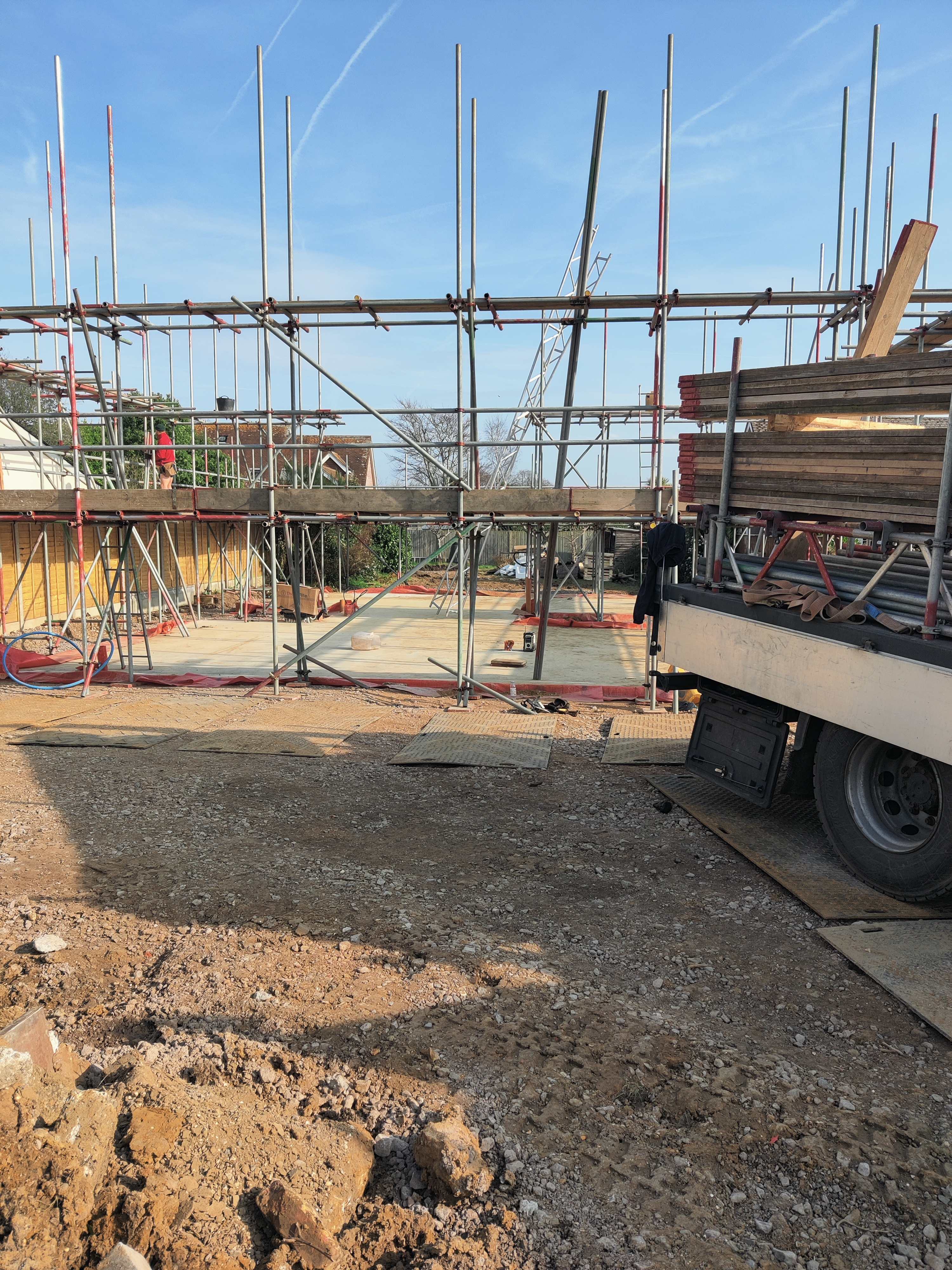 It was one year ago that we started our house build, and we moved in 4.5 months later on July 3rd. Well, that's the headline to catch attention, but there needs to be some qualification. A year ago we started building above ground. Before that, we had 3 months of asbestos removal, demolition, site clearance, excavation, concrete slab, drains and scaffold. But still, 19 weeks to build everything above ground is good. Our method: MBC completed the timber frame in 8 working days - that was a great head start. We had a fixed price contract with a general builder for all the external finishes. This meant we could leave him to manage that whilst we concentrated on the interior. We had plumbing, electrical and carpentry trades working on site in parallel. The house was big enough to have separate working areas. We (the client) were always present to create the culture of collaboration and courtesy. Me and the Mrs worked full time on the build without employment to distract us. One of us would be on site before 8am to open up whilst the other was doing desk work: chasing quotes / delivery / documentation etc. We had very few times when the site was unsupervised by one or other of us. We were disciplined in making decisions in the right order and not changing our minds. We lived a 5 min cycle away in a rented house. Cycling is ideal because you don't take up parking space on site, and you can come and go without asking trade vans to move. Our builder saw the advantage and started cycling too. We had Travis Perkins, Screwfix and the electrical wholesaler all within a 10 minute drive. I could collect ad hoc materials before 8am with an estate car + roof rack so the trades weren't waiting for materials. Our builders merchants is a favoured supplier for kitchens / bathrooms etc based 100 miles away. We worked closely with them to keep their supply of materials ahead of the trades. I did three months of carpentry assisting the proper carpenter. If I wasn't supervising deliveries, doing a site induction for new workers, cleaning up, moving materials then I was doing carpentry. The site was always clean and tidy with waste promptly taken off site. The site was working 5 days a week, every week but typically not weekends. And when we moved in, there was another 6 weeks to completion and then the landscaping after that. Photographs attached from one year ago Build photos here: https://forum.buildhub.org.uk/topic/45435-project-finished-mbc-timber-frame-self-build-220m2-over-three-floors/#comment-634389 VID_20250219_094732.mp4 UBox_20250222_153442_246_019_P.mp4