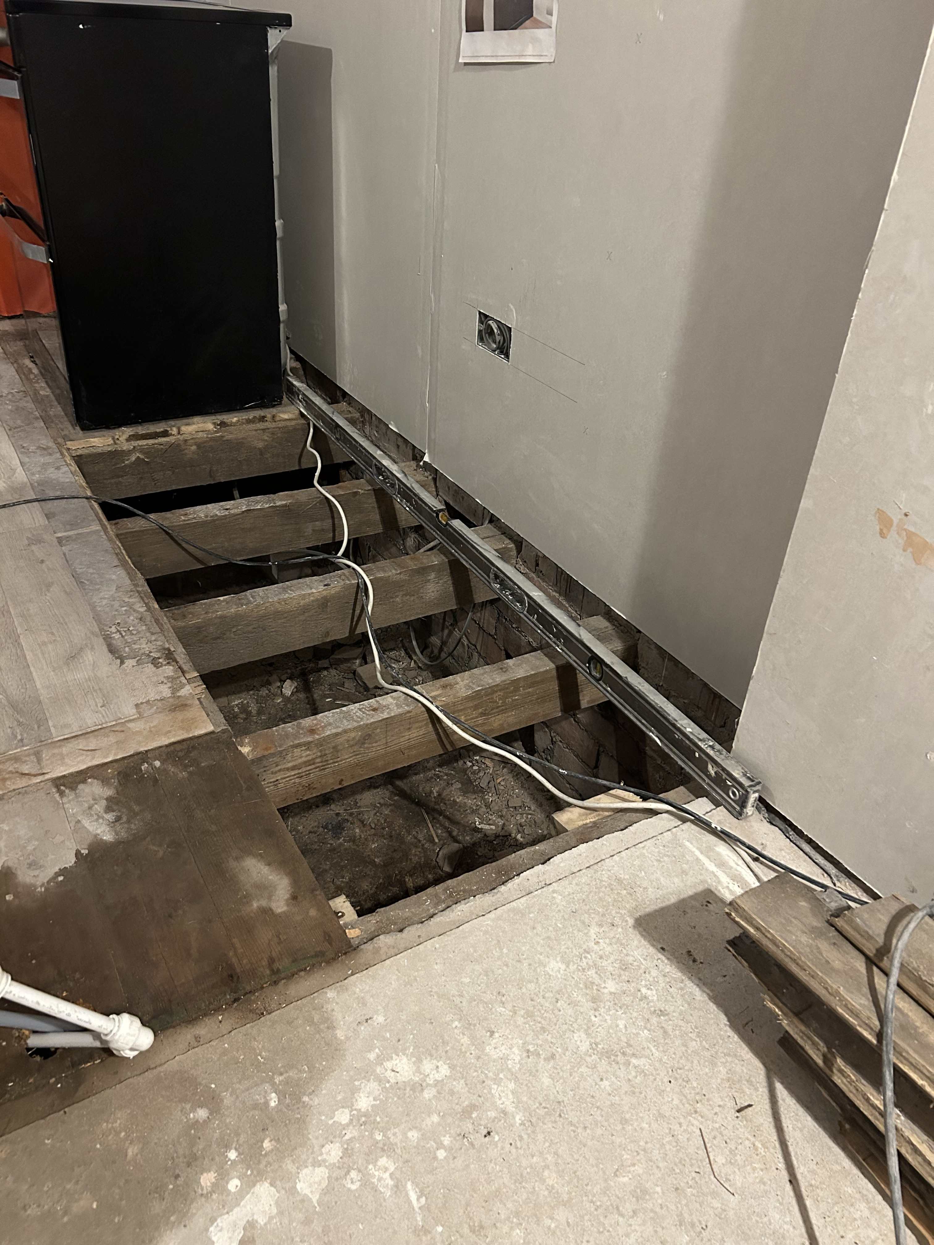 Hi, we are going to have LVT laid on the whole hall and kitchen section incorporating the new concrete and old suspended floor. our joists dip into this corner (floor boards are in a bad way as kitchen units have been on top for years) so I need to level up (sister some 5x2 onto the old joists sitting them proud?) you can see the run off from the concrete edge getting larger. i will then replace the T&G with 18mm (or more?) ply glued and screwed. Should I just butt upto the concrete, pass over the top so the SLC can butt upto it, or something else?? cheers