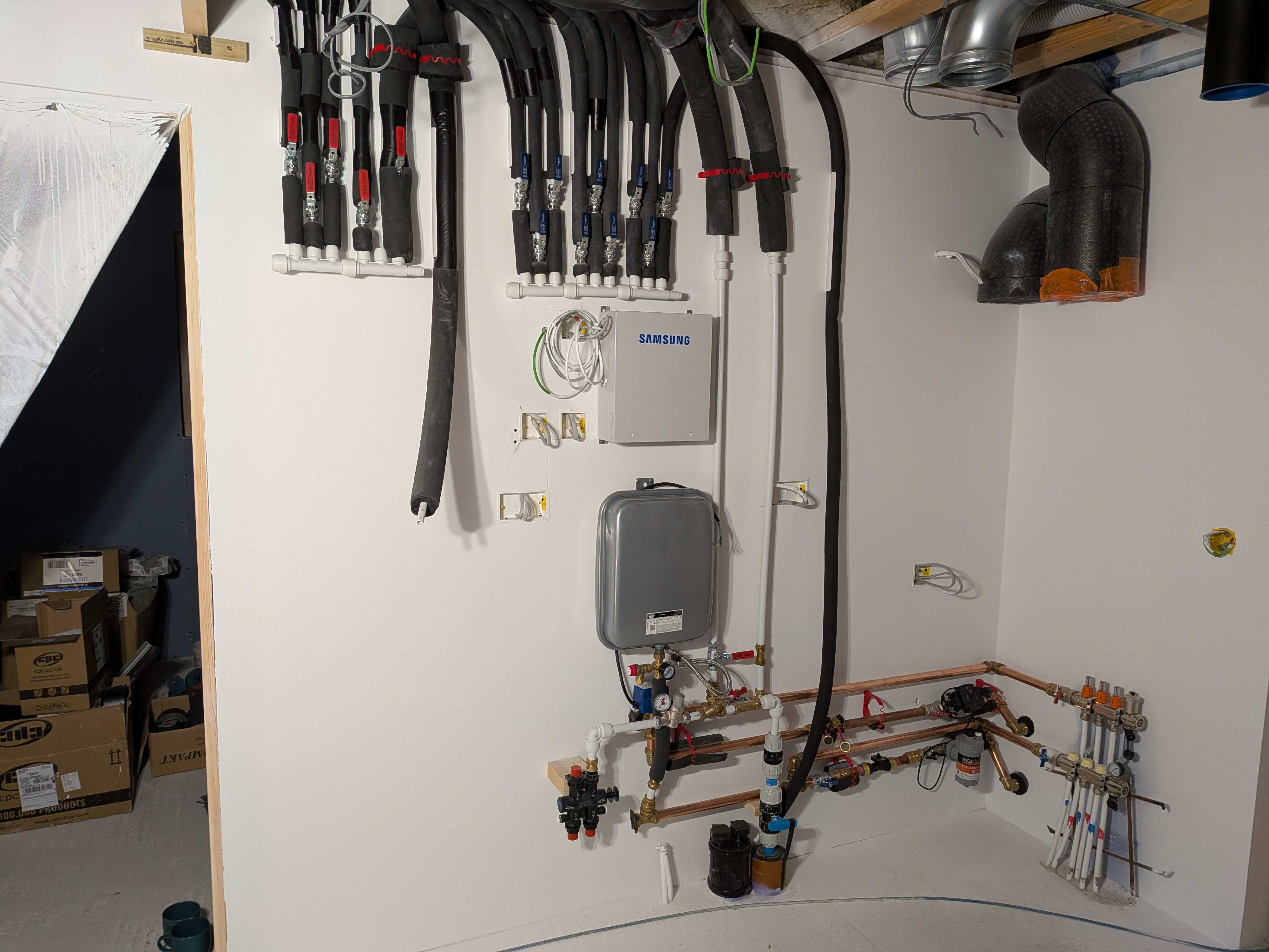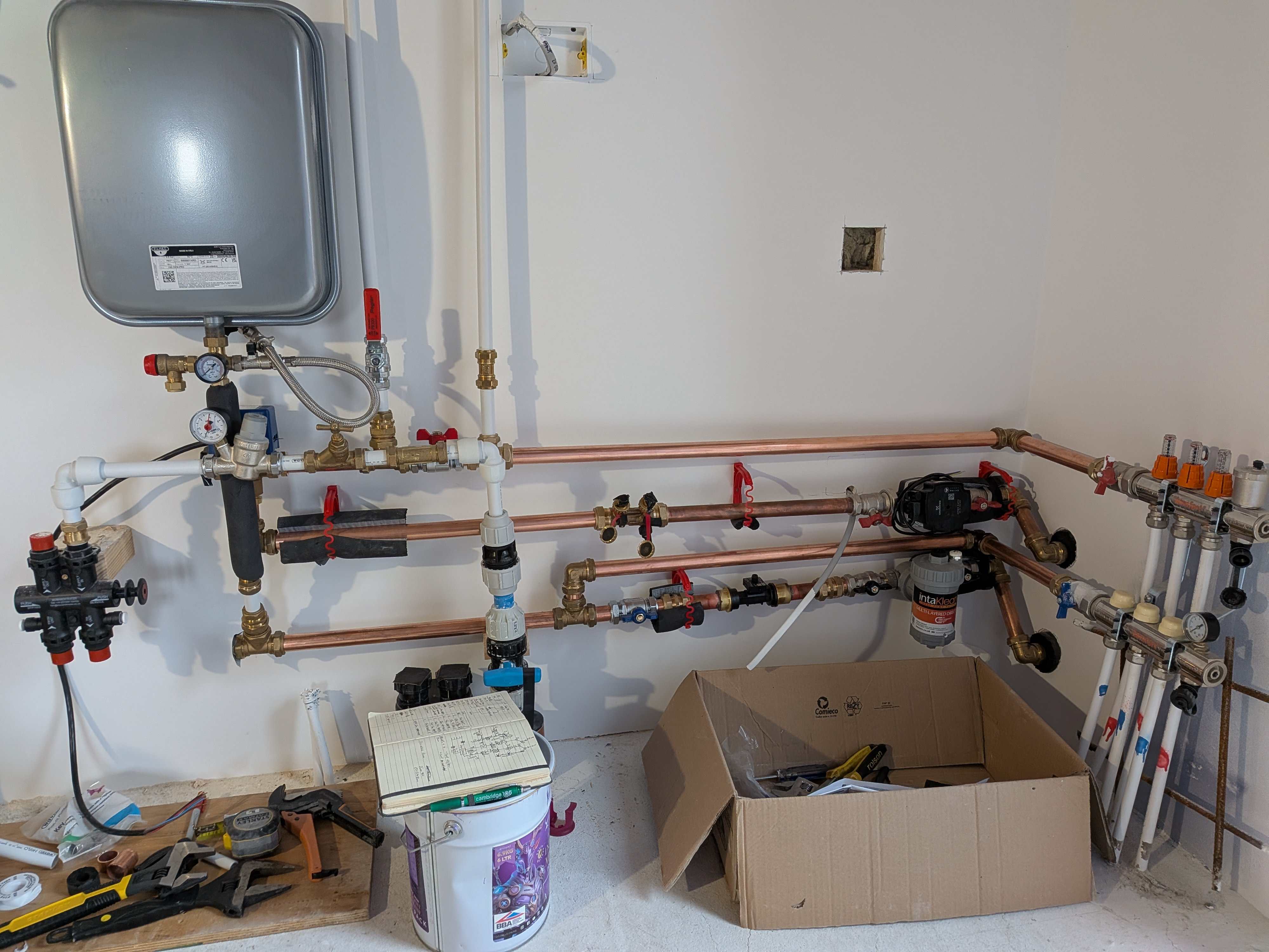 Hello all, thanks to the fantastic BH I've had a go at my UFH / DHW install. Be nice (please!) but tell me if it's wrong! Q1: how do I go about filling the system? Do I use the full and flush valve, hose pipe? Or pipe in a hep2o from mains? Q2: I have a huge plastic container of glycol for anti freeze. How do I get that in the pipes? How do I get the correct ratio? Observations: DHW Will loop to UVC, but currently loops back to exit so I can get the system running as I need to commission the slab with heat cycle.