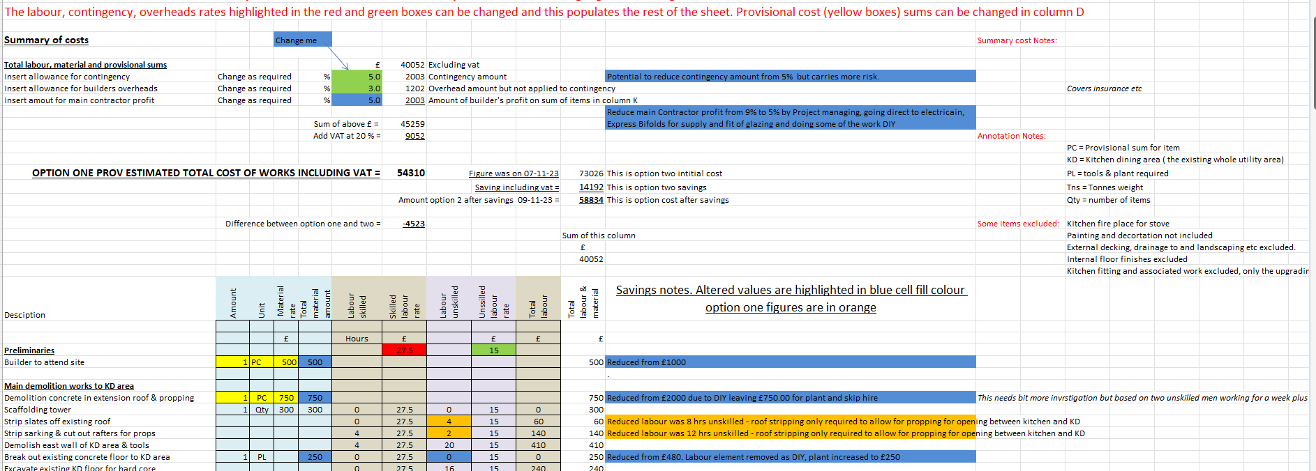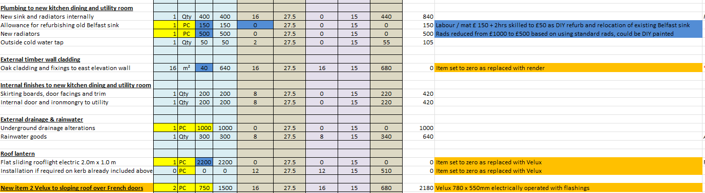Ah, tongue in cheek. You can ask ten designers like me and get ten different answers. So long as each answer is reasoned out and evidence based then that lets you make an informed descision. Sometimes these descisions are based on you just saying.. we like and want that, yes we recognise that it may not be the best technically and SE wise, but we want it! So long as it does not fall down, leak water etc this is our choice and just get on with the design. This happens a lot. Ok, that is good. If you like a spread sheet then set up another tab for labour cost. What I'm leading you towards is this. When you design things you are aware that the Client has a budget. When I'm doing this I always have at the back of my mind that if I introduce complexity, design some steelwork say, that very quickly the labour cost can escalate. Insulation/ air tightness details can be very labour intensive.. and to get them right you need a level of site supervision. Builders will often get apprentices to stick on the tapes that you are basing a lot of your calculations on.. mistakes happen! Complexity also adds additional risk to the Contractor who has to make a profit. You, at the stage you are at, don't have the experience yet, but you can experiment, just using your common sense with a bit more research. Set up a tab that looks a bit like this. I made this cost sheet for a Client like you, to play with. And another part of it.. I hope you can read it as have screenshotted it. The labour rates are maybe a bit low now. The main thing to take away from this is to say for two site operatives you are looking at well over 2.0k a week, before profit etc, down south or in say Edinburgh you are looking at a lot more. My inclination is to look for where we can easily insulate, do the structure in a buildable way. If you take this approach it frees up cash to spend on the things you see and enjoy. What this does is to let you see how quickly the labour cost can get out of hand, but also make savings. If you look at the top bit you can see I have contingency, contractor profit and so on. If you just set up a tab like this for now you can add to it as you go. This is a bit of philistine stuff but you can have a look at commercial websites like check a trade to get a feel for labour and cost rates. You can ask your local builders, here on BH.. feed all of that into your spread sheet to get a reasonable rate for your area. In the round you need to strick a balance.. but with a bit of thought you can often get to install the things you love..call these a luxury item, if you can make pragmatic savings elsewhere. -
