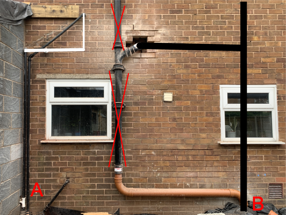 Right, I've made it to the outside and need to figure out the arrangement here... Hopefully it's clear that the original / temporary stack is to be removed and the new stack is going over to the right. Option A - I personally prefer this because it gives me a sharp drop immediately after the WC outlet - similar to the way it was installed originally which has always worked very well. Its a bit lower, but still around 2.4m at the join to the new stack Option B - seems more conventional, about 200mm higher. Might end up having to use a strap boss for the 50mm pipe at the stack which I don't really like. What's the preferred way to do this, and whereabouts are inspection / access covers recommended? Pipework all to be boxed internally: