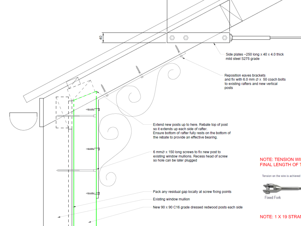 Ok to bring this into the domestic context. I upgraded a 1920's conservatory, to stop it falling down. It needed some additonal structural skeleton and some crack stitching ect. The glazing is irreplacable as it the brick plinth at the bottom of the glazing. The roof is a modern abomination.. but fixed that. The top bit cantilevers over the bottom and the steels were rotted and needed replaced. Hat off to the Contractor who managed to install new steels , do other stuff without cracking any of the glass. The above is a work in progress. But you can see I've put a new timber structure (supposed to look modern) inside and tied the rafters with wire and turn buckles. Below is a bit off the drawing for the tie wires I selected this wire as it has less strands, less flexible but stonger. The wire you see has a factor of safety of 5.0, some ropes you see often have a factor of safety of 7.. but for good reasons which I won't go into here. So @SteamyTea you are right, the designer needs to select a cable that has the best balance between strength and flexibility.. the more strands, often the more flexible. One strand can fail with less impact, but you generally get a reduction in over all strength with many small strands.. the reasons are complex unless you use a fatter cable. If I was designing a ballustrade say at around the edge of a balcony I would not use this type of wire. I would go for something with more strands as it's more flexible and workable on site, even if it is a bit less strong. A common offering is a 7 x 7 rope that has 49 strands. The rope you see in the example above has 19 strands. So do I. There are many that swear by a D4 rated glue.. but this is not a stuctural glue. The D relates to the durability primarily. It does stick things a bit structurally but I won't sign off D4 glue (unless it also has a structural rating) in structural timber applications for example. One default timber glue is to use something like Cascamite.. a resin glue that has been on the market, tried and tested over 40 years.