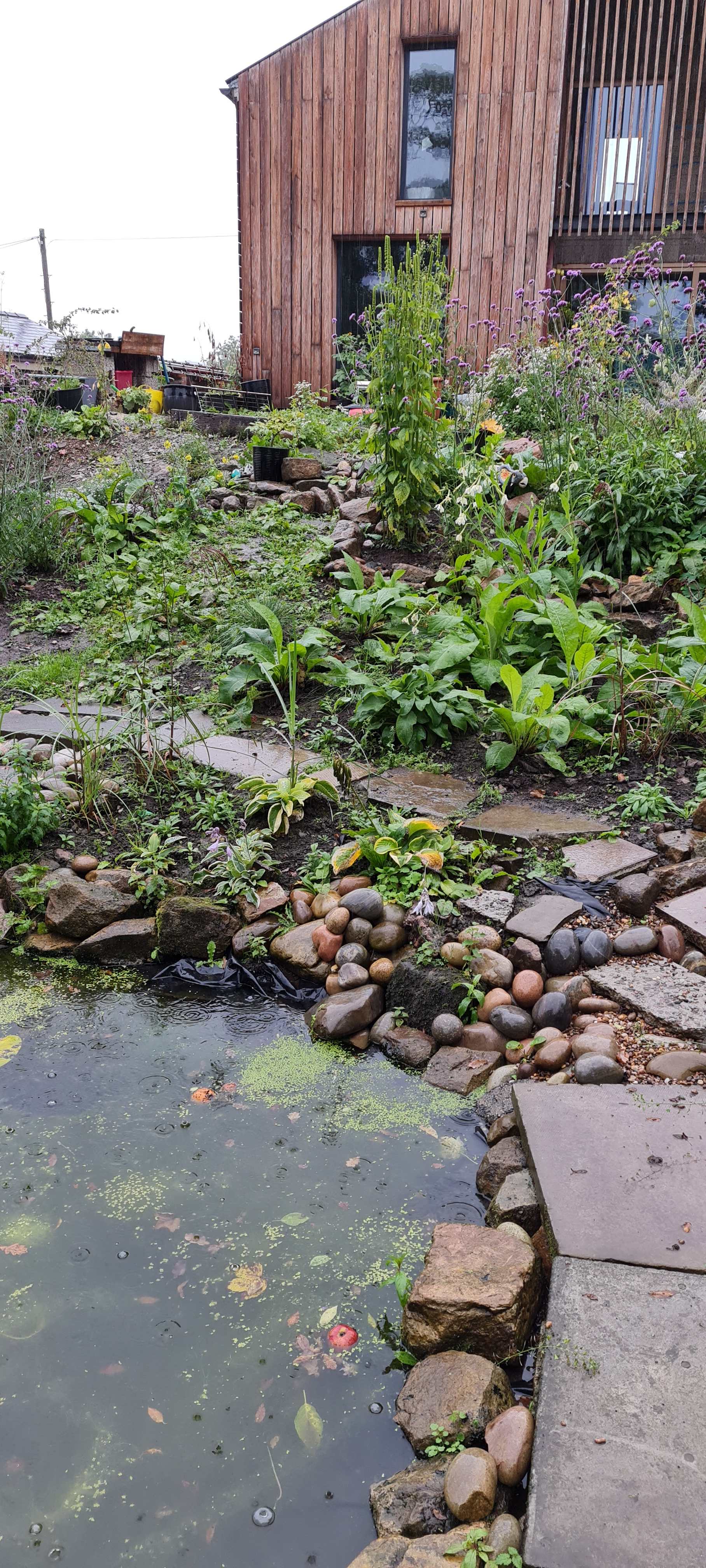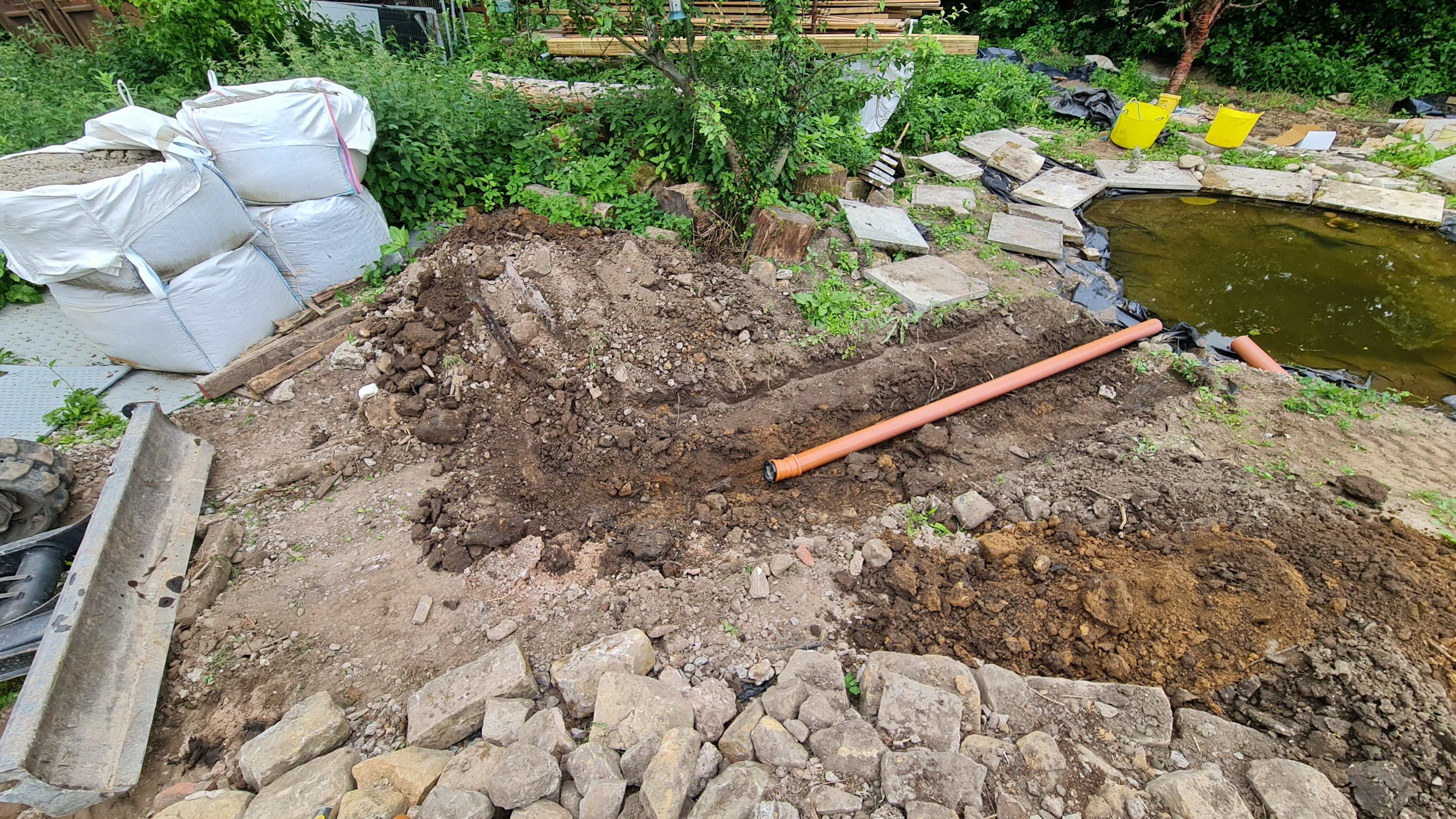Not much need for commentary : the pond is fed entirely from the roof run off. (SUDS) Cost? Absolutely everything inclusive : £5 or 6 hundred. Tops The sand (bulk bags) in the photo below is 'buried' under the garden as a filter for the roof run off. Its been working hard recently 😑 This is where that pipe in the photo above runs into the pond. Overflow from here into the pond in the field below our site ( The one with the GCNs in ) -
