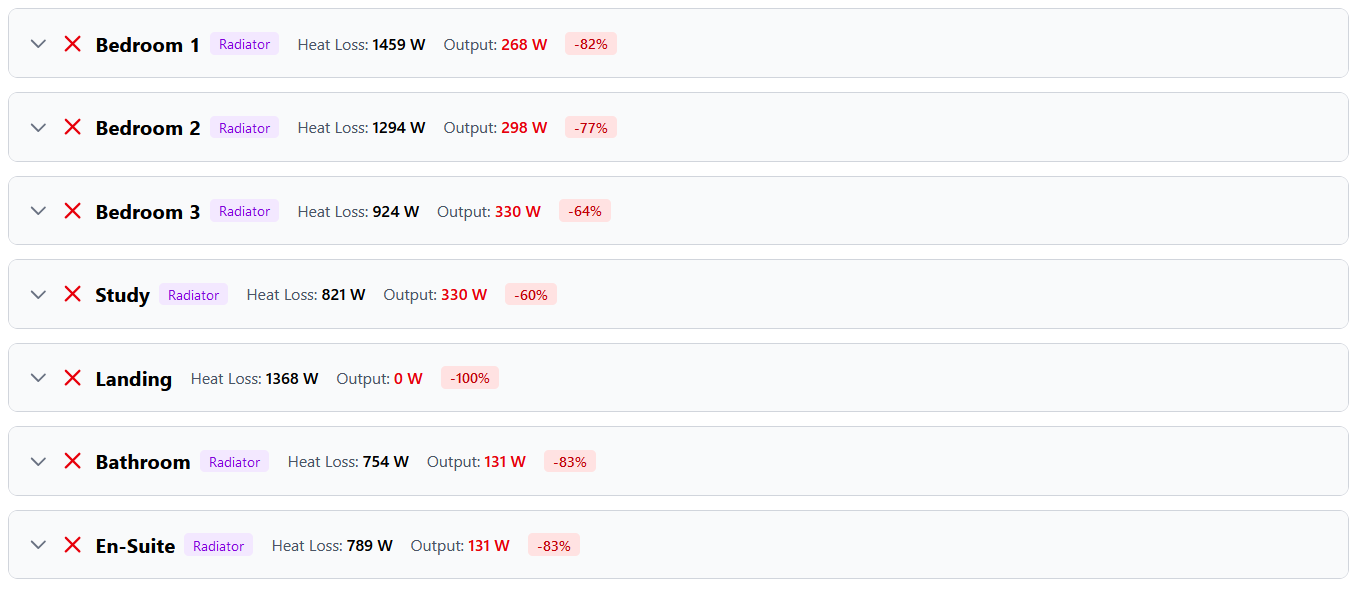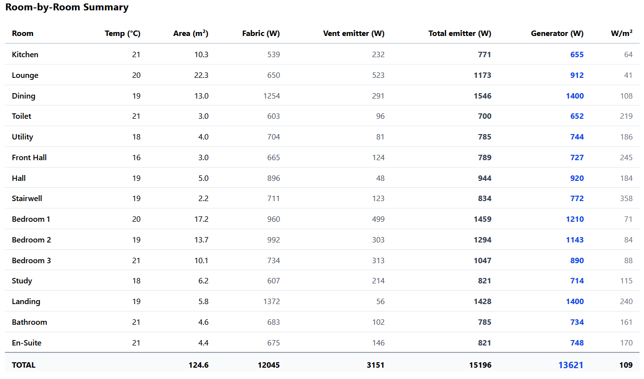OK that makes sense - I considered removing all the doors from the landing the whole landing, hallway stairwell area is also a bit tricky I broke it into chunks to make it easy for me as they are all linked but only one radiator (albeit a big one) is in the lower hallway (so the tool says it's oversized) however if I add all the reqts together it's in line with the other rooms It used to be a 550 by 800 T11 - it's now a 500 x 1400 T22 Makes perfect sense - before I insulated between the joists of the ground floor with 75mm PIR you could feel a draft in most rooms when the wind got up - now it can be a bloody good gale outside and there is no drafts at all........ I know I've got the house reasonably well sealed hence the installation of a PIV unit to manage humidity and ACH's (But it's not MVHR )