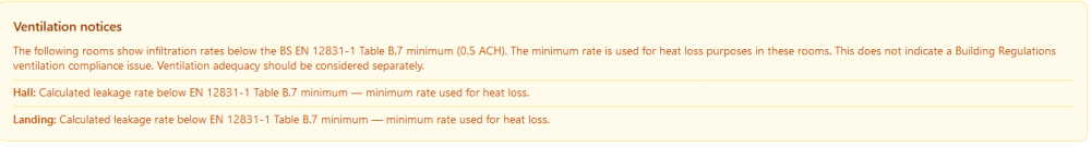That's actually what I do when I have a space like a hall or landing and when I have rooms with large open plan openings, so I create a non-existent door - as long your room dTs match, and set to 0 then it doesn't impact the fabric losses. It also shouldn't affect the ventilation losses because the exposed envelope is set and the calculation uses that. It's a bit prescriptive on the ventilation, so there isn't anything immediately available to make adjustments to this ventilation factor. There are still some questions about how BS EN 12831:2017 treat ventilation and the CIBSE guide uses a bit of SAP in there. I'm going to have a think about this one. It's really the way it's calculating infiltration leakage which is giving you the high figure, but you've got to be a bit careful how you interpret the Ventilation - Emitter Sizing. This calculation isn't saying that you are going to use this amount of energy at a given time, which is your Fabric loss and Ventilation - Generator Sizing. The Ventilation - Emitter sizing, although provided as a total, should really be looked at in relation to individual rooms because it's essentially calculating the effect of high winds on each room based on the exposed area. So at any given time the rooms won't be losing all heat to the outside, but transferring to other rooms within the building. But high infiltration will increase the heat load within the room subject to high infiltration and so the standards are encouraging us to install slightly larger radiators and thus improve efficiency. Does this make sense?