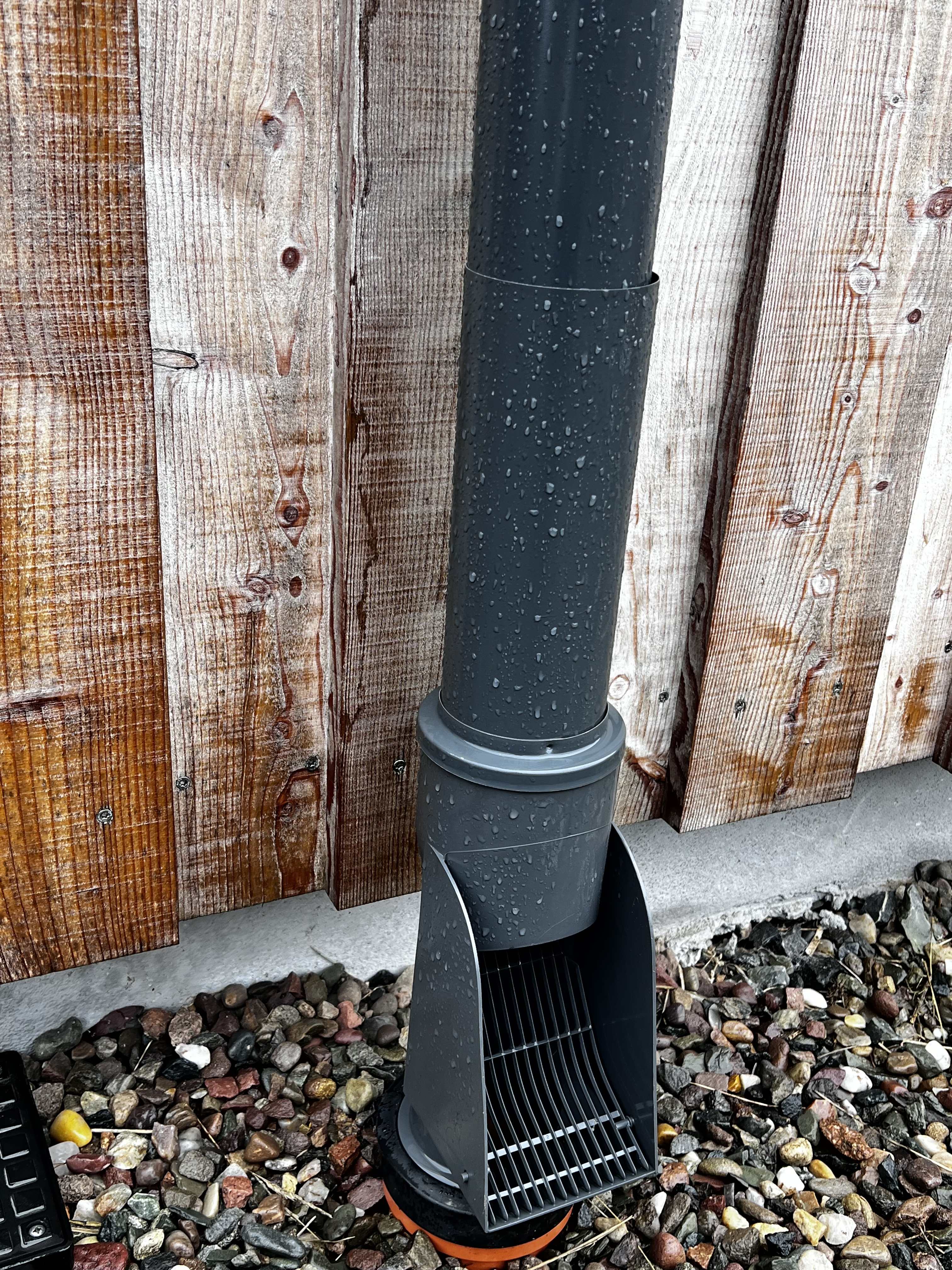 Self-cleaning is a bit of an overstatement by Lindab although the debris does end up in a neat pile in front of it. My only criticism of it is you need three bits. The downpipe, a shoe and the self cleaning trap. Four bits in my case as I also used one of those rubber boots. The plus side was I was able to use a single run of downpipe as the shoe and trap added length.5 points