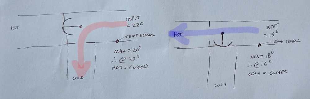 Hello BH, another wacky question for discussion. I would like a Thermal Diverter Valve (TDV) in my setup, to send cold water through the FCU in summer, but hot water to the UFH in winter. I would like this TDV to be self regulating, so that I can set and forget. My thought is to use a Change-over/Diverting valve with a constant temperature Controller. I would use the valve in reverse essentially. If I set the controller to a MAX of 20deg, the hot water for the UFH at more than 20deg will close the HOT outlet of the valve and open the COLD outlet - this is sent to the UFH. If I set the controller to a MIN of 18deg, the cold water for the FCU at less than 18deg will close the COLD outlet of the valve and open the HOT outlet - this is sent to the FCU. Change-over/Diverting valve: https://esbe.eu/group/products/rotary-valves/vrg230 Constant temperature Controller: https://www.esbe.eu/group/products/controllers/cra200 comments?