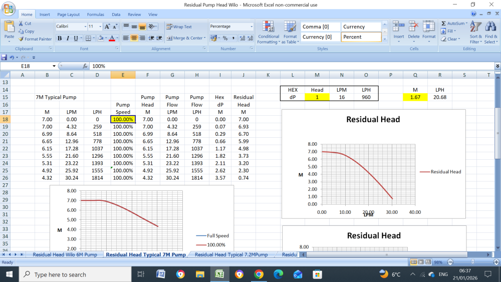 @EinTopaz I think I may finally have a answer to your query..... " if its 15-70, why is setting 6 (400mbar) show as pump output 100% on the boiler LCD display? Does that essentially mean its got way more head than it's able to use? i.e it's capable of 700mbar, but can only run 400mbar max? I find the manual quite confusing here and it'd be great to understand" The pump appears to be able to calculate the speed required to give a RESIDUAL HEAD of 400mb based on the HEX dP and the system/Rads dP, in your case, with a new clean HEX and because of your system resistance then the pump has to run flat out to achieve this residual 400mb, you can read off the flowrate from the Residual Head chart, which is 20.7LPM at 400mB, the clean HEX dP is only 1.67M at this flowrate. I have based the HEX dP on one I think is correct for your boiler, you might ask them for it sometime. -