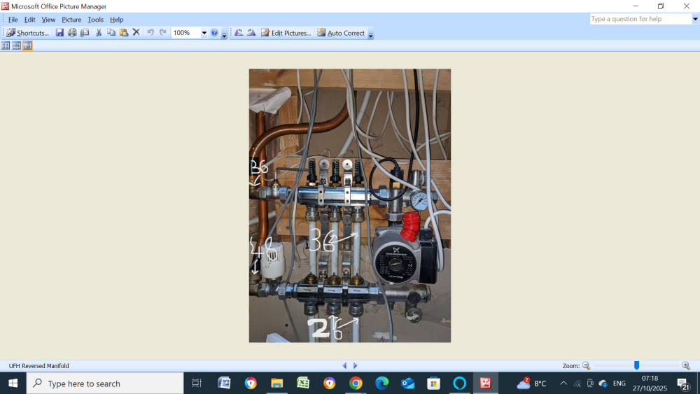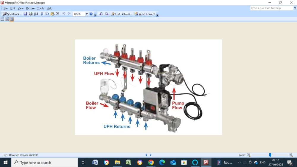 I don't know how how you can reduce the heating loss through the manifold, the only heating loss that I'm aware of is radiation losses which can be improved by insulating the manifolds?, In my (daughter's) case, as long as the water returned to the boiler is less than 40C then it doesn't matter whether like your set up its at 36C or 26C (if you had a conventional UFH where some of the UFH loop outlet water is returned to the boiler. Her boiler has a TMV set to keep the boiler return at 40C, it just mixes some of the boiler flow water with the return water, obviously more HW required if the return is 26C vs 36C, there are also no losses associated with this TMV. For example, if her system had a UFH total flow of 7.5LPM, then its output (and the boiler's) at a dT of, 36-26, 10C, is 7.5*60*10/860, 5.233kW.. With a boiler flowtemp of 54.5C and a return of 36C, then the boiler return (before the TMV) flowrate is 7.5*(36-26)/(54.5-36), 4.05LPM, 1.12LPM of water at 54.5C must be added to give a boiler return flow of 5.17LPM at 40C, if the return is 26C, then the return (before the TMV) flowrate is 7.5*(36-26)/(54.5-26), 2.63LPM, 2.54LPM of water at 54.5C must be added to give boiler return flow of 5.17LPM at 40C, boiler output 5.17*60*(54.5-40)/860, 5.23kW, equals UFH output?. You can see it doesn't matter what the mixing ratios are, same with the UFH mixing. What have you done to improve your own ASP COP? You can theoretically run that at 36C/26C, flow/return with no mixing to improve it, this has nothing to do with the mixing though.