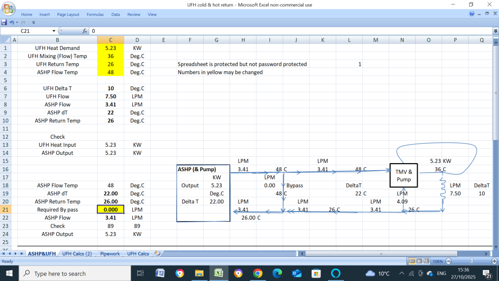 No, its the boiler return temperature that primarily determines the Boiler efficiency, the colder the return temperature, the colder the boiler flue gases are, leading to greater efficiency, if you could lower the retur temperature to say 20C then you would have a almost 100% boiler efficiency. The flow through the loops will always and only be greater than the ASHP return flow when the required Loop flow temperature is less than the ASHP flow temperature, for example, with loop flow/return of 36C/26C and ASHP flow/return of 48C/26C, the % ASHP flow is (36-26)/(48-26), 10/22, 0.4545, 45.45%, a loop flow of 7.5LPM will return 7.5*45.45%, 3.41LPM to the ASHP and recirculate/mix , 7.5-3.41, 4.09LPM with the 3.41LPM from the ASHP at 48C to give the 7.5LPM at 36C loop flow temp, (3.41*48)+(4.09*26) = 7.5*36. If, both the flow/return temps are the same for both the loops and the ASHP, then both flowrates exactly the same. The bottom, 4th fom top screenshot below shows this, the 3rd from top screenshot shows the bypass required to give your required ASHP flowrate of 20LPM. The 2nd from top screenshot shows the data if you run with loop and ASHP flow/return the same at 36C/26C and the top screenshot just below shows the bypass required to give that required ASHP flowrate of 20LPM. Hope this is of some help.