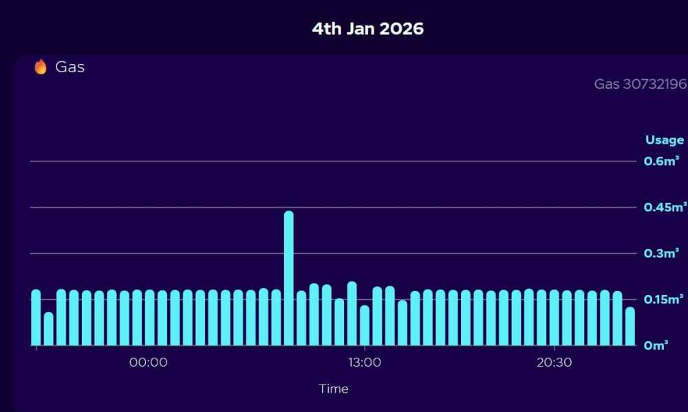 OAT overnight -4.4 Deg C highest temp in the day -0.2 Deg C but it wasn't there for long All internal room temps held nice and stable Boiler ran from Midnight to just before 10am with one burn (it finished that burn just before the HW cycle was scheduled probably due to OAT warming up or the modulation blips threw the flow temp over target. Avg energy usage for that period 3.81 kWh That's quite impressive considering the modulation hiccups it has on a regular basis Looking like my heat loss calcs are a little more than actual ~4.25 kWh @ -2.5 OAT From my Octopus account Gas usage over the 24 hr period Overall the whole day saw the boiler do 7 cycles (normal is 20 to 24) Bloody modulation blips annoy me still..............