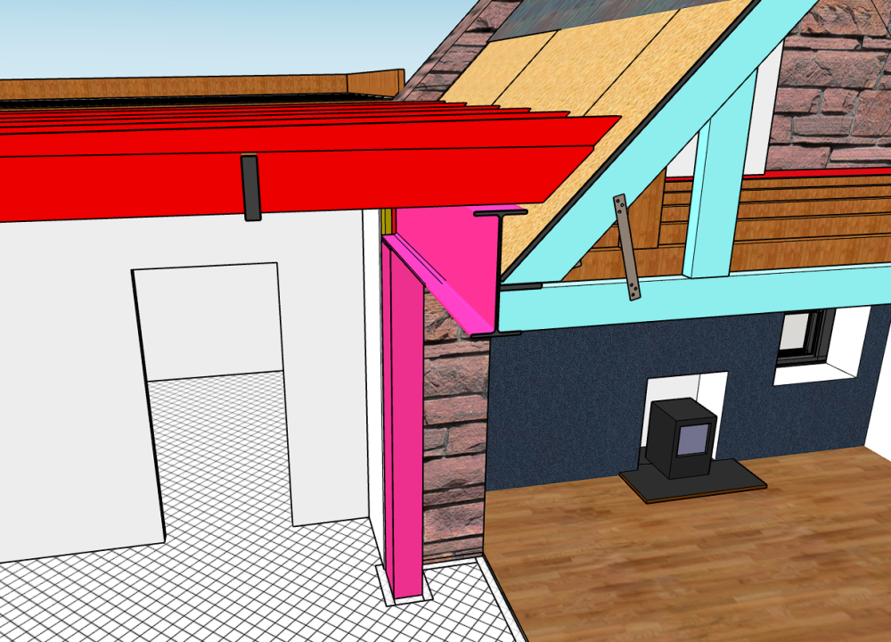 Hi folks, I'm working on the design for a new extension (all in Sketchup). Loads of queries to come and I'll probably put my drawings up here soon for scrutiny. My biggest headscratcher just now is how to support the existing roof structure when I remove a 6.5m length of structural stone wall. I've seen various ways to do this with joist hangers and sandwiching timber on the steel, but I'm wondering why I can just mount direct as shown below. I've coloured for clarity...Blue = existing roof trusses and joists. Red = new extension flat roof joists and firrings. Pink = Steel Existing timbers I'm sure will not be perfectly aligned so my thinking would be to leave a nominal gap and shim to the steel, or to profile the face and underside of the joists a tiny bit to fit. Thoughts?? Pitfalls??