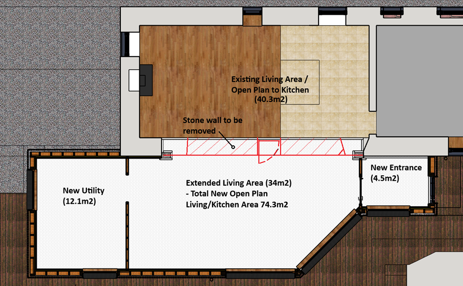 @JohnMo you're right, more detail required...below is a rough layout of existing and new. Open plan area will be almost doubled. Intention would be to have a small radiator in each of the new well insulated Entrance and Utility rooms. It's the extended living area that I think would benefit from UFH. As I say, there's also an open stairway so with radiators I practically need to heat upstairs before downstairs gets warm, although nowadays with the ASHP on all the time it's not such an issue. My thinking is that I wouldn't need/want to fill the entire new floor with pipes. In theory I just need to replace the heat from an existing 1200x600 K2 radiator that will be removed along with the wall and maybe a bit more to help reduce the flow temperatures from my ASHP (and hence improve efficiency). "Power Output at Delta 50" for the K2 rad removed is about 2080W. So if I assume that I want, say, 3500W Power Output at Delta 50 for the UFH then how do I go about detailing the pipe length, size, spacing? How do I determine if a single loop is sufficient? And how do I determine if the ASHP pump is up to the job? Worth noting that I will still have another 1000mm K2 radiator in the existing living space, and if I find the ASHP flow temps are then too low for the rest of the house then I can always switch that off (until I upgrade some rads elsewhere in the house). Hope that makes more sense now.
