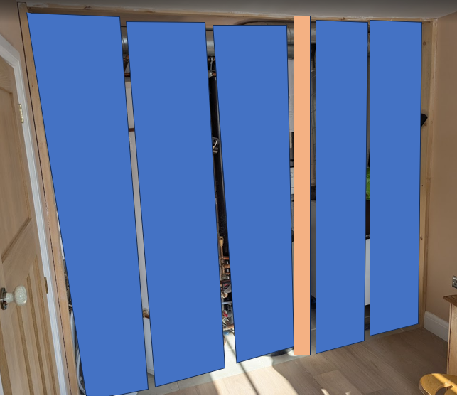 Hello all The next item on my to do list is to screen off this jumble of heating/ventilation/solar kit. My current thinking is to use a bifold door/room divider system with top track. Due to the door to the room on the left of the picture and need to access the MVHR unit on the RHS I would look to probably have a 5 door sliding system split 3/2 with a post to the left of the MVHR (very rough sketch below). Having a quick google there are a few companies do the door systems, e.g. https://www.aspire-doors.co.uk/internal-doors/internal-bi-fold-doors. I would go with a solid door rather than glazed. Does anyone have any other clever solutions for screening this off? Has anyone any recommendations for systems/suppliers for internal sliding door systems? Thanks in advance. James