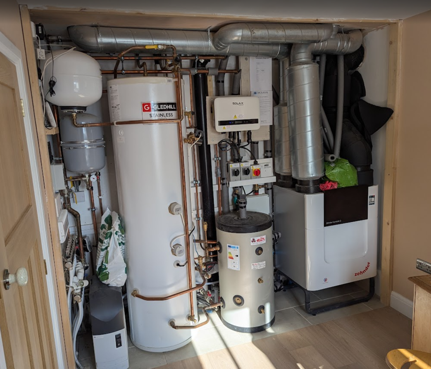 Hello all, moved into our extended/refurbished house a couple of months ago. We have ASHP (Daikin unit), hot water cylinder and buffer tank. The space heating has 4 zones in the house (upstairs/downstairs, old house/extension). The system was designed by the Daikin rep at the local plumbers merchants, install by local plumber and signed off by separate MCS certifying company. I am not 100% convinced that everyone in that chain has done what they are supposed to as when I quiz one they refer to the others. If I was doing this again I think I would have taken a different route. We are getting hot water and in the colder months heating was working fine. Now we are into summer I have put the master controller into 'heating off' mode. My understanding was the buffer tank was just associated with the space heating and would therefore be cold when the space heating was off, but it has remained hot. I quizzed the plumber who installed everything it who says that the buffer tank is used when the DHW tank had got up to temperature to allow the ASHP unit to wind down, as it couldn't turn off straight away. Seems wildly inefficient to have a tank of hot water sitting there for 6 months of the year. Interested in other people's thoughts and suggestions. Plumbing drawing and photo of installed system below. Many thanks. James