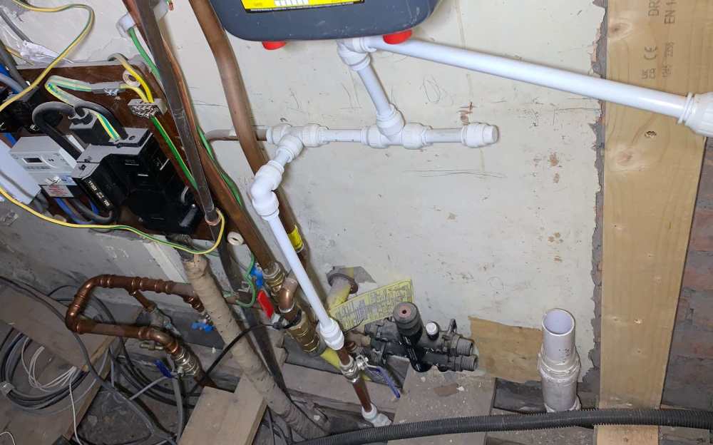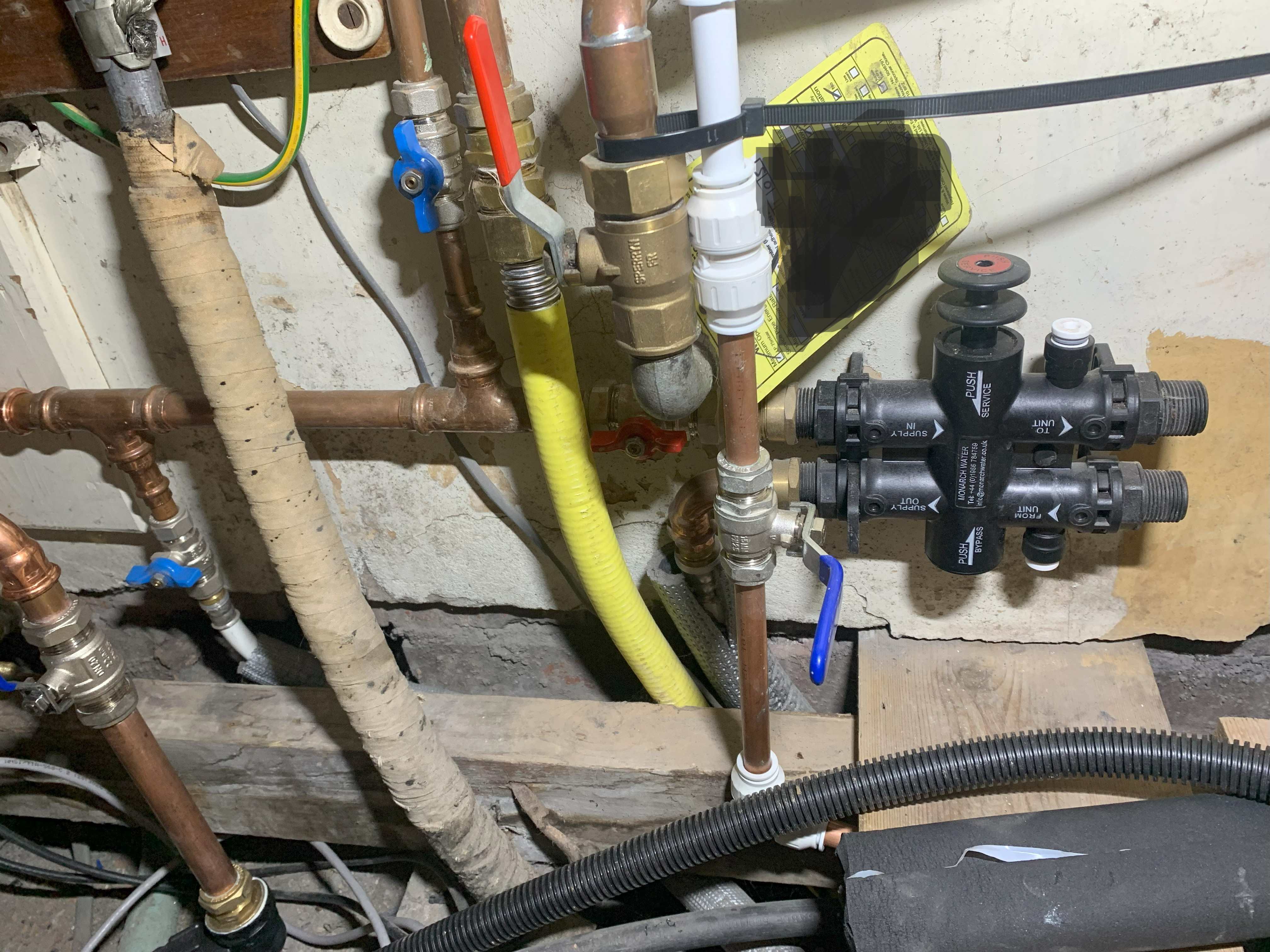 It is actually a right bu***** muddle at the moment under my stairs. (I have had a constant nightmare with plumbers that say they will quote but don't, say they will come but don't, pop in to do something temporary and then never come back, only seem interested in doing the fastest possible rush job using only what is on site/in the van, don't really seem to want to solve issues, and/or want to bill criminal charges.) See photo. If anyone can offer any suggestions for how this should be sorted I would be very grateful. (Sadly I have the electricity main, the gas main & meter, and the water main all coming into an understairs cupboard.) On the left front you can see a 32mm MDPE water main at sub floor ground level, which has been connected to 22mm copper. This runs around in a 90 degree arc out of picture to the left because it still connects to the out of use lead pipe with a stop tap there. Left middle in the photo there is then a 15mm tee down into a blue valve (off) and connector to 16mm MLCP - this MLCP runs as a mains water feed to my kitchen sink location. Next along another 15mm copper tee with blue valve (on) that feeds (1) the outside tap and (2) an MDPE pipe under the floor that runs down to the end of the garden 40m away. The connection to the garden MDPE pipe was made temporarily just to test for leaks - comes vertically down in copper with a blue lever valve (off). Then a bypass valve for a monarch water softener (never yet installed) - bypass valve badly needs moving to the left to make proper room to connect flexihoses to the water softener. Out of the bypass valve into a 25mm MLCP to the cylinder location 5m away (where it connects to 22mm copper to feed the pressure reducing valve). You can also see the mains cable front left, middle is the gas enters through the wall and feeds upward in copper through the meter above and back down to join the yellow gas feed off to the boiler. (Meter man can't touch the gas feed pipe, plumber can't touch the meter etc) Answer welcome for a beer should we ever meet and a donation to the forum.