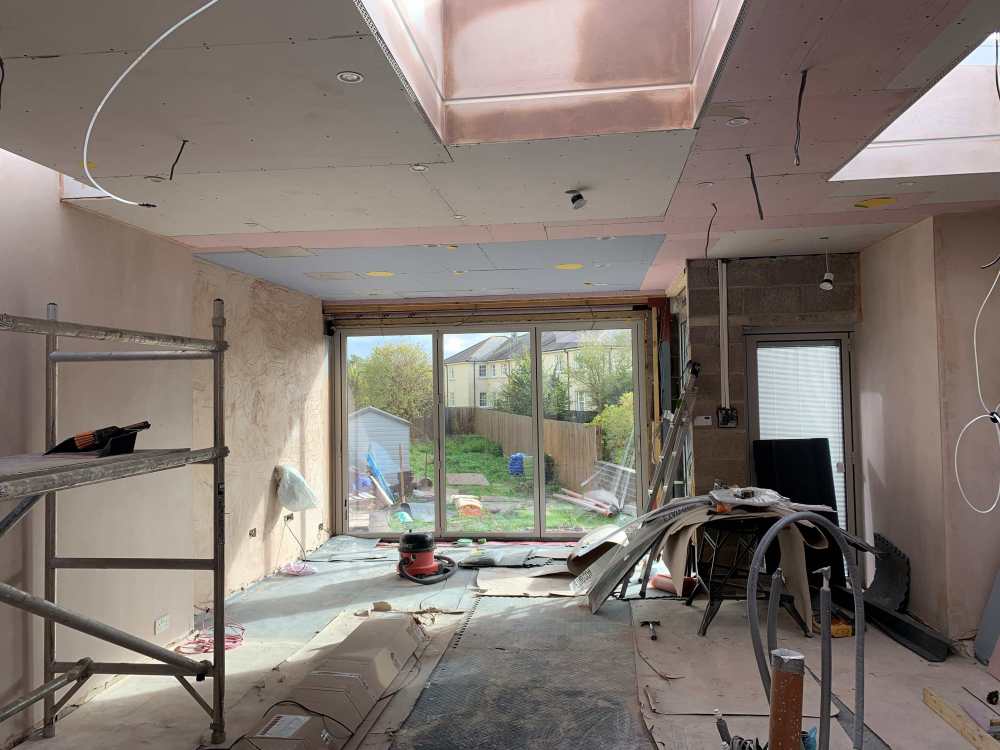 Thanks Nod & Mr Punter. I am getting very worried now. I have a kitchen fit booked for 6 weeks time and mutiple issues: My plumber has cancelled. I am waiting on delivery of blind boxes before studwork and boarding can be done around bifold and window upstand. And the carpenter guy seems too busy with his own renovation to ever turn up to do anything. Extra kitchen cabinet has to be ordered due to enforced design change - no surety of delivery in time yet. Plasterer has proposed boarding and skimming the ceiling to within 12-18'' of the bifold & window, then coming back to skim the edge and downstands after the kitchen and floor are fitted. Claims he can do this and protect the floor. (Plastering is unbelievably messy though) Plasterer wants every light hole cut before he skims (is this really necessary ?) - we still have some lights to finalise and buy. Plasterer wants ceiling speaker holes cut before he skims - but speakers not chosen and position still debatable. Decorator not fully committed. Flooring - suspended floor areas not ready yet - still covered to protect from plaster and damage. Can you partly skim plaster a ceiling, then come back and skim what remains ?