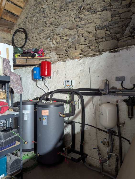 Sorry, I did say rough and I meant it. Good question. One tank is DHW, the other is a 100L volumiser, plumbed on the return leg to the ASHP, radiator pipe in at top of tank, exit to ashp at bottom. DHW right, volumizer left.