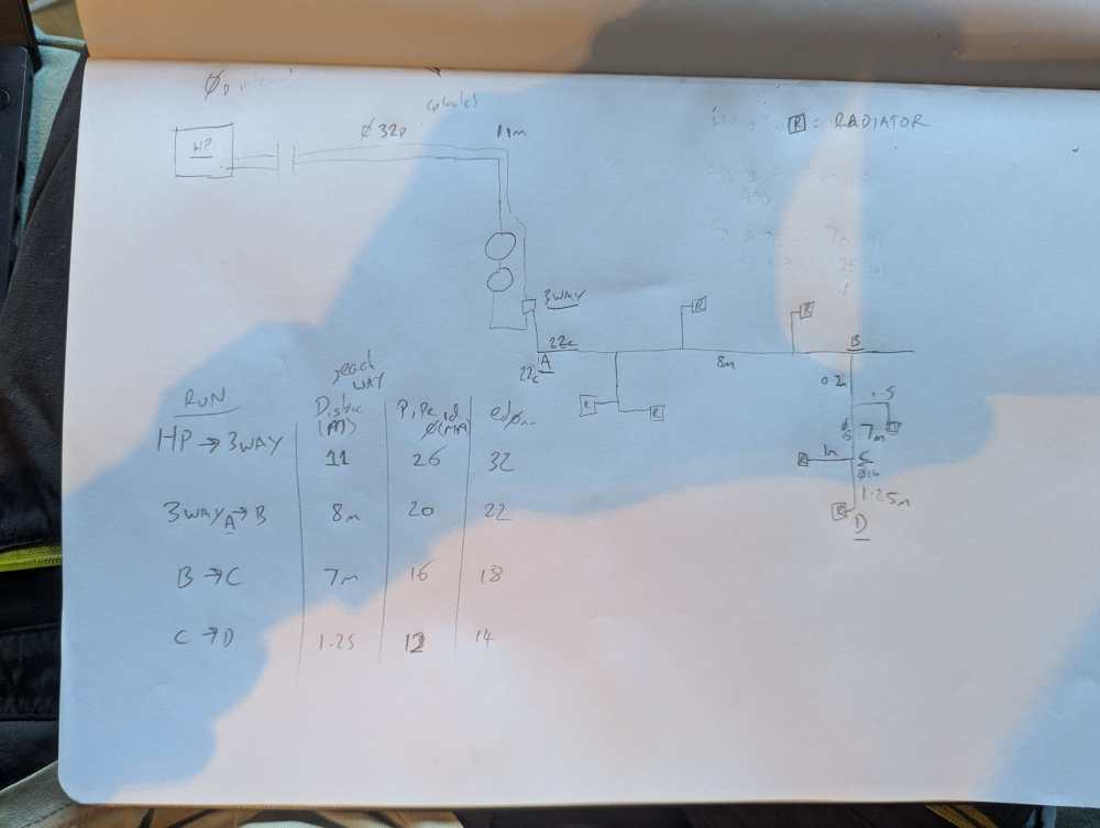 Another question. I noticed the flow return pipe between the 3way valve / volumiser and radiator input is done in 25mm plastic, so 20mm internal. It's about 3m of pipe overall. From A to B. After point B, the copper pipe splits immediately into two 22mm coppers one for upstairs on for down, so it is a restriction. The pipe between diverter is 32mm external. If on DHW cycle we get 2000l/h but 1700l/h heating circuit. Could this short stretch of reduced pipe be reducing flow so much? Before I ask installer to change.