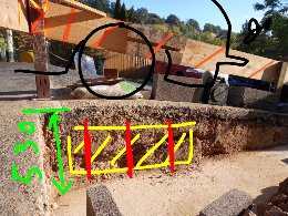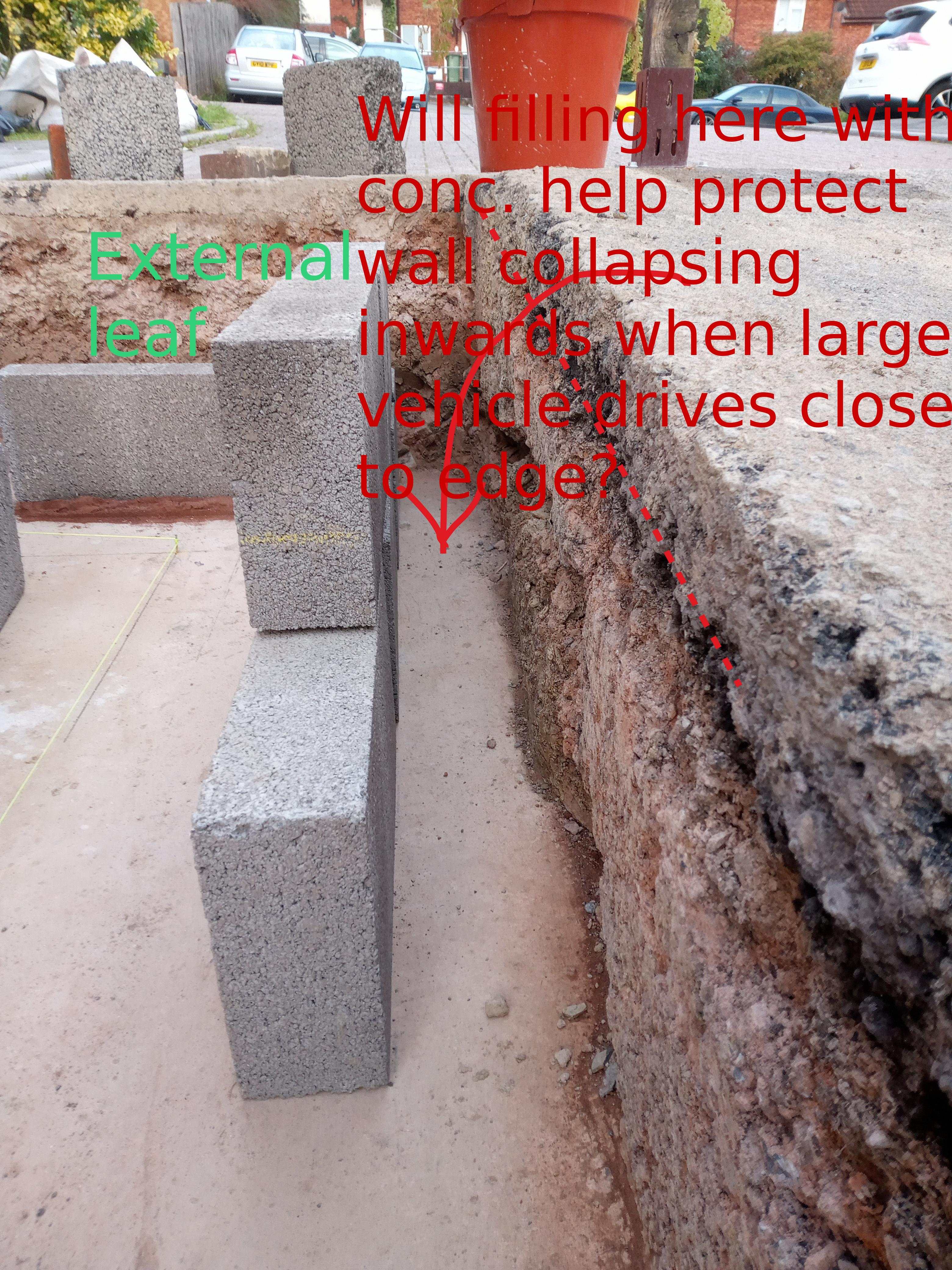 Morning all. Looking for some engineering consideration. Please see images. Here we go! The exposed face of the small car park is, at its tallest, 530mm measured from the foundation. It gradually slopes to less. The total wall thickness is 340mm: block-infill-block. It's standard practice to infill wall cavity with a weak concrete mix. However the maximum I can fill to is 320mm (above foundation). As otherwise I start to get close to internal skin DPC level. Occasional car traffic uses this small car park. And a few times a year you'll see a heavy lorry reversing down to drop something off. The foundation projects about 120mm from the outer skin. S.E. has suggested that filling this void between the outer skin and the excavated edge with concrete will protect the cavity wall from collapsing. This solution is not ideal as the external concrete will then be higher than the infill so would water in the cavity have trouble trying to escape? Secondly I struggle to understand how filling the external void with concrete will help prevent the cavity wall from collapsing inwards? Won't a vehicle parked on the tarmac close to the concrete cause a horizontal component of force which would be transmitted through to the block wall via the concrete? My suggestion was to epoxy a few vertical T12 rebar rods in a line, maybe 3 across a metre, and slide a metal stainless steel panel between the rebar and the edge as an additional retainer. I wouldn't need to do the entire length, just the highest point, so a metre should do. I'd then back fill with soil/MOT Type 1 and tarmac. Thanks all! Stu