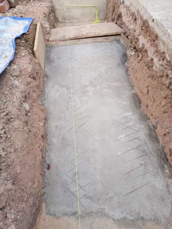 Greetings all Trench fill happened yesterday for small side extension (3x4m footprint). Footings are about 600mm thick and 600mm wide. Checked levels today and there's up to 25mm deviation in height and if viewed in section there's a slight dish (up to a 10mm dip across the width of the foundations). Also the pour is 10-35mm below the finished depth we agreed. To be truthful I am upset as builders quoted to dig,rebar, box-in pipes and pour. The digging was hard going so of course I helped dig. I boxed in the pipes and even resin-fixed all the rebar. We've had some down pours so I've painstakingly kept the site as dry as possible with tarpaulins / pump etc. I asked them to drive stakes in to ensure level all around which they argued against. They said they'd use a laser and would get it to within 10mm and that I should trust them. When the concrete arrived I thought best to leave them to it so they can focus. 4.5T of concrete was poured in about 10 min and I returned after about an hour to find they were packed up and about to leave. I asked if they used the laser, they said they had. There was a bit of floating water but not much and I covered with a tarp. I'll get over the disappointment. Just hoping it can be worked with. Does the 'dip' across the width of the foundation matter? Can this be leveled off with mortar before laying the first course of regular block? It is definitely there (the water pools along the centre). Should I be grinding down the sides a bit to better level? Excuse long message. Part of the healing process! π₯΄ Thanks all.