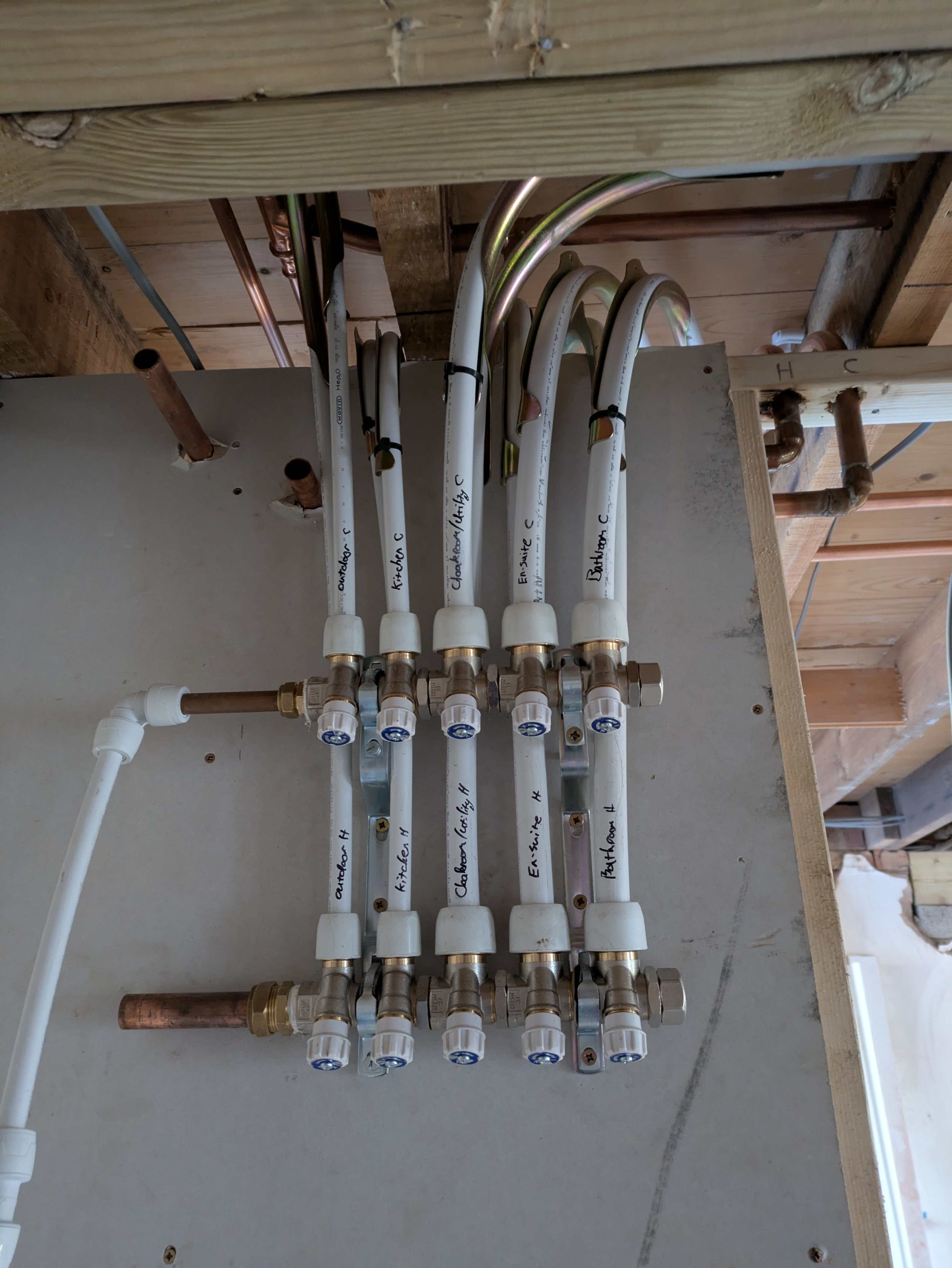 Thank you @Nickfromwales @torre and @JohnMo We've completed first fix and I'm super pleased with my water set up ☺️ As I have a joist in the room I can actually box off the pipework, keeping it fairly neat. I used hep2o manifolds with built in isolation, and regular branching at each room. The plumber wasn't so convinced that the manifold system will help any but did like that we could isolate the outdoor taps in winter. I used 22mm and 15mm hep 90 degree bends which the plumber found more useful than he thought they would be. The manifold bracket looks to have worked great! I see others used Munson clips but I bought the manifold mount just to try. I realise I've gone against advise here and have 22mm for the hot! Things just got done and I didn't catch on until a bit too late My components 15mm manifold (2 port, available in 2,3 &4) 22mm manifold (single port) Manifold mount 15 & 22mm 90 degree bends 3/4 iron to 22m compression 90degree manifold cap My plumber changed the end fittings over