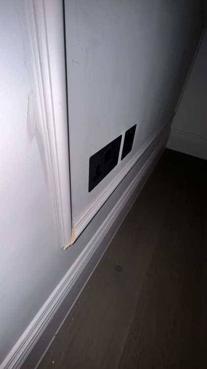 Hi all Need a bit of advice.. I was installing panelling trim at a friends house over the weekend and when putting one piece on, we found that there was a bulge in the wall right towards the end of the trim piece by the plug in the picture and as such, the end of the trim won't attach to the wall. What I am concerned about is if I push it back in place and then put a small pin/nail in, this might pull the rest of the trim off the wall again or worse, split the wood because its so small and thin 😐 Should I use a nail gun or will it be better to just use a hammer and small nails/pins? And what size nails/pins? 🫤