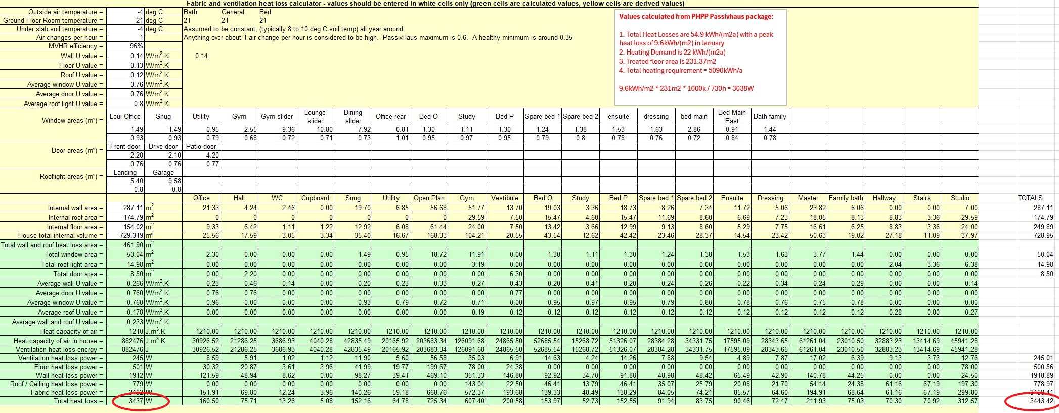 As promised – I wanted to share the stages I worked through to calculate the individual heat loss from each room and the required pipe spacing for the underfloor heating in case anybody finds it useful: 1. I used Jeremy Harris’s Heat Loss spreadsheet to calculate the Whole house heat loss using average U values at this stage rather than individual U values for each type of roof and wall buildup 2. Once I was happy that the whole house calculation was as accurate as it could be – I used the same spreadsheet to create an extra column for each individual room. Initially I also used the average U values so I could be sure that the sum of the heat loss from each room was the same as the whole house. The results were a few W out, mainly down to internal wall measurements and slight rounding errors. -