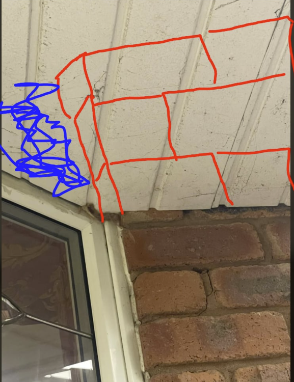 Hi all, Noticed something I thought was odd on our bay windows, and wanted to check for sanity. Wasn't sure if this was best in the roofing or Window sub category so will delete and re-post if this is in the wrong place, apologies if so. Anyway, Two of our ground floor bay windows are this sort of setup, where the brickwork beneath them projects out from the property with the window, but the brickwork above the bay window does not. I was looking at having the Windows,fascias and soffits replaced and on inspection earlier today I noticed the area directly above the window appears to be a recess, where the brickwork just stops. Its hard to see clearly without ripping off the soffits etc. But my question is, if I was to remove the soffits and fascias and all the little 'roof' section above the bay window here, if it was 'built' properly should I expect to see a lintel on the inner skin and the rest just solid brick work? Or is it correct to have a big recessed void between the brickwork above where the baywindow is? Tried to draw what I'm describing on my phone on the image below. Red is where the bricks carry on, blue void. Cheers Ged