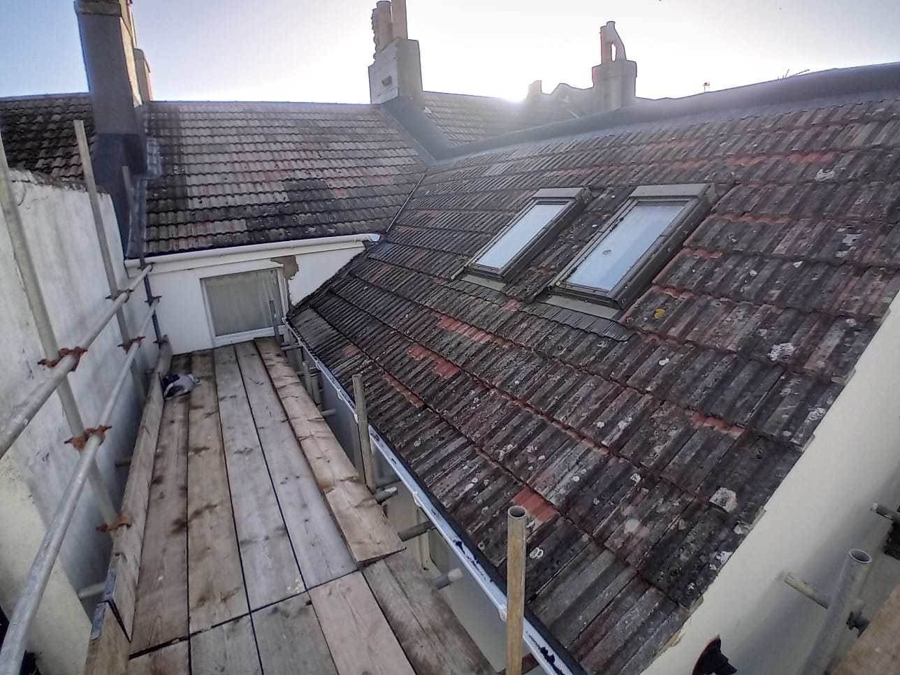 1. A roofer who is also a surveyor was helping out on an unrelated, non-roofing job and raised a lot of issues with our 6-month-old roof. Are these problems I should raise with the original roofers and/or fix ourselves while there's scaffold? The render has cracked so I'll be raising that at the least. Or, are these minor quibbles that aren't worth worrying about? Any views would be much appreciated, thanks. According to the critical roofer: The tiles (49s) haven’t been nailed. He says because we’re within 1.5 miles of the (South) coast, British Standards say every other course should be nailed; They’ve put timber in two places at the valley to support tiles. This shouldn’t have needed to be done. One of the tiles has already dropped. The timber will rot and then more tiles will drop. The roofer who did the job says the batten tilt under the lower eaves is fully treated and won't rot; The felt and breathable membrane extend over the gutter - he says the felt should have started higher up and will rot and water will be soaked up under the roof. The roofers fitted felt, breathable membrane and TLX Gold insulation; Some of the lead hasn't had patination, harming the lifespan. He said the horizontal lead has had patination but the vertical hasn't in the picture below; There should be lead straps securing the lead flashing, there’s minimal headlap – he estimates 50mm -, and they should have used 38mm nails instead of 50mm, with the risk of piercing the insulation (which did happen). The roofer who did the job says that’s wrong and 50mm is the right size. The whole roof: Thanks again