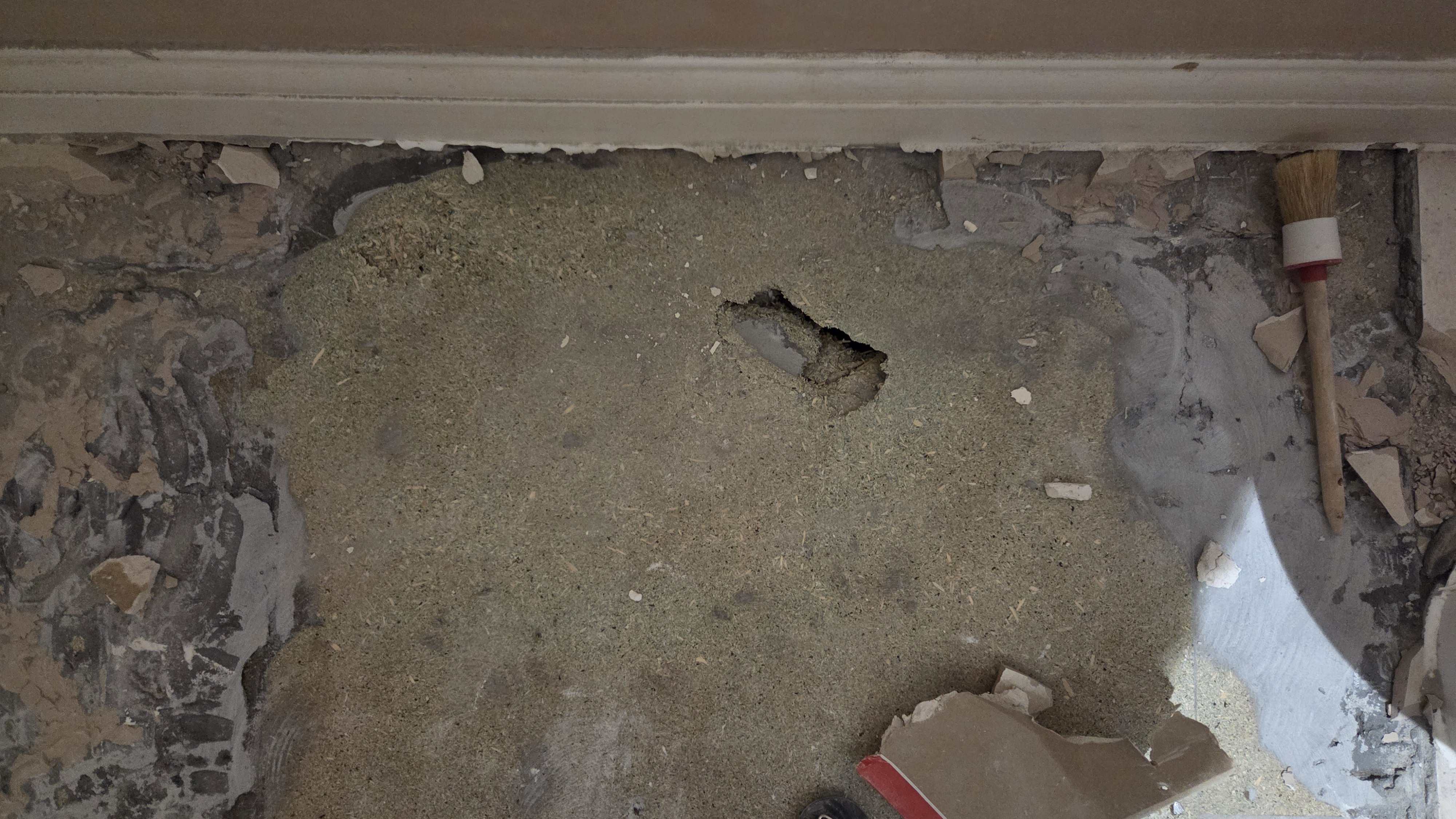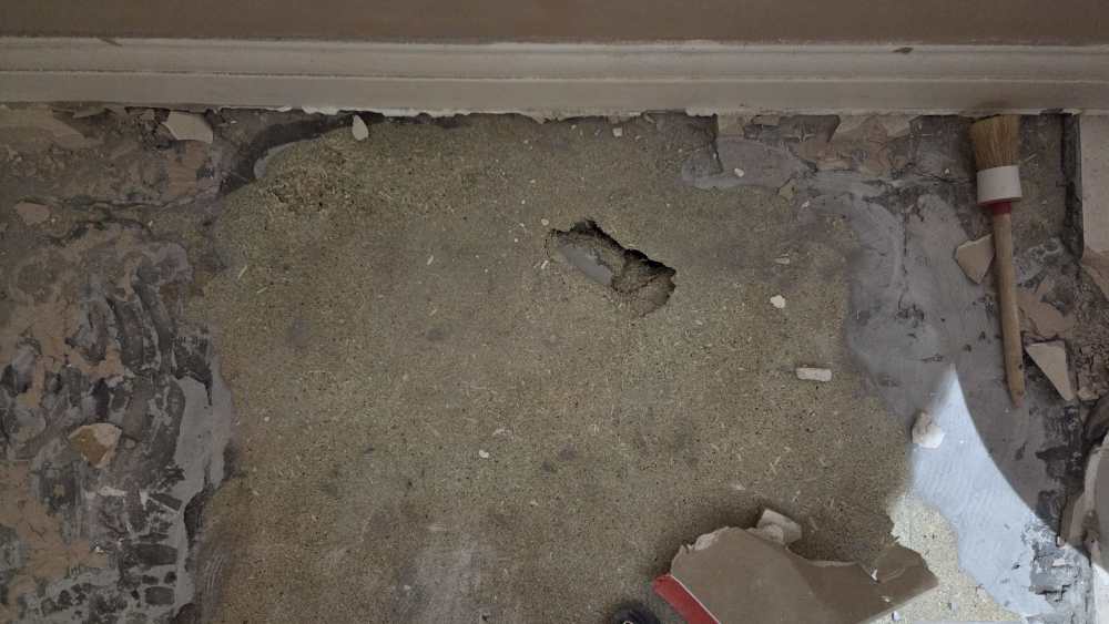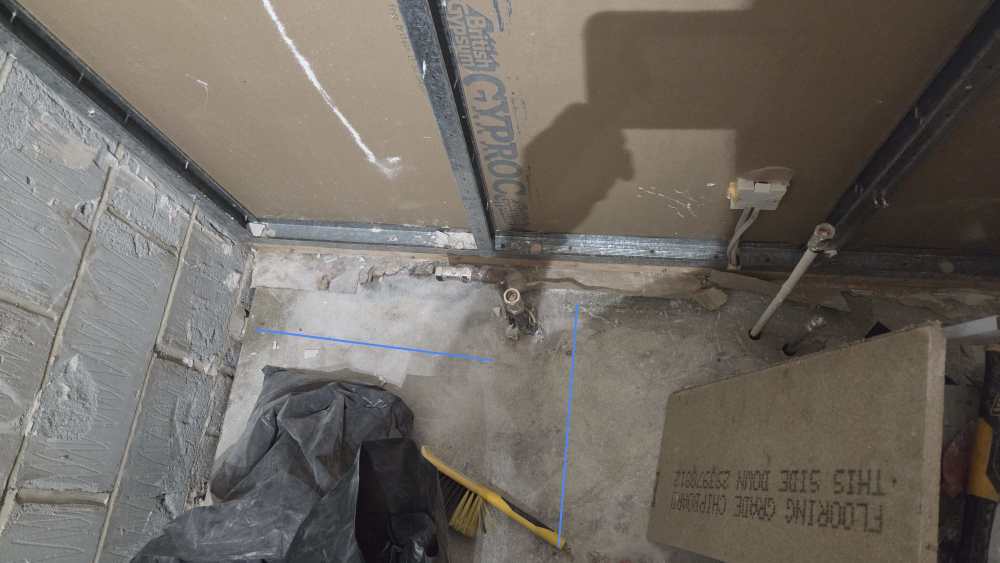 2. I'm redoing my bathroom and have chipboard down. I want to reroute existing Mains water feeds for the basin and it would involve removing enough to get to where it comes off existing 22MM pipe shown. Joist and joint line for one 600mm wide board is in blue. What can I do to replace this section of floorboard based on it being under the stud at the moment? Also, I've gone through the existing board in another section with the SDS ripping tiles up, is this repairable with just cutting out and noggin it etc?