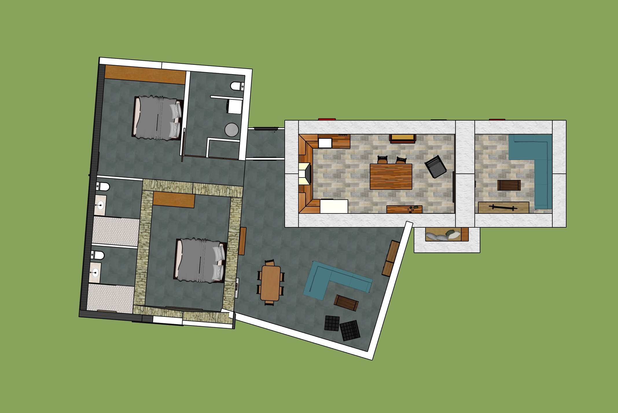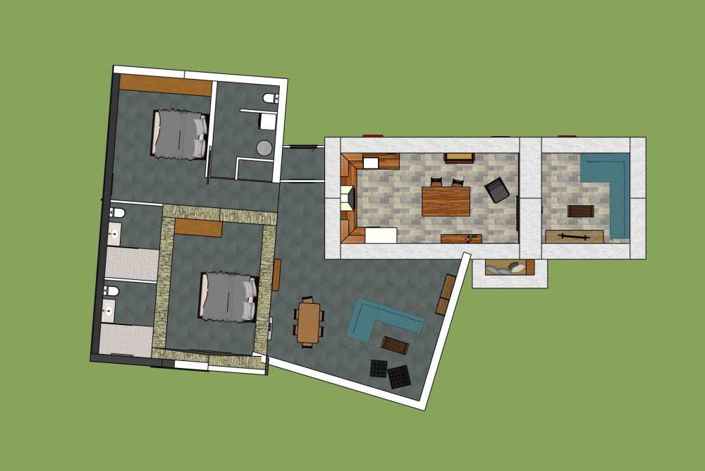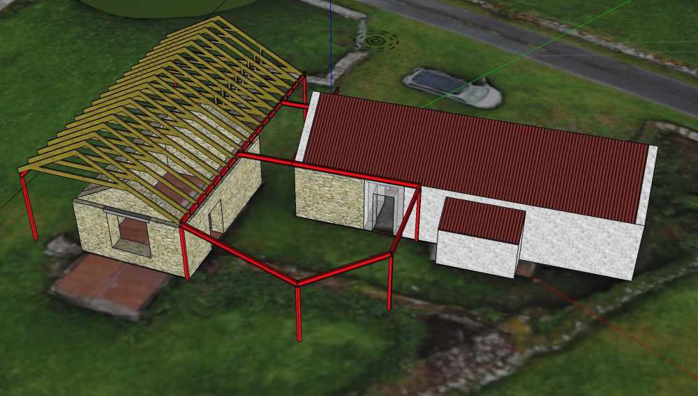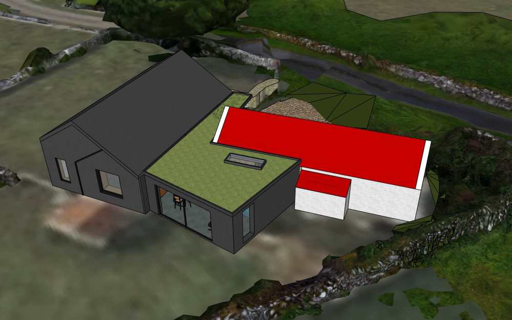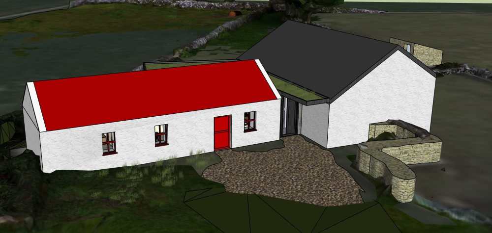 Our current plan is to restore the cottage in an authentic traditional way, with breathable lime plaster. But have a new well insulated roof, door, and windows. Then link it to the barn with a flat roof extension. The stone barn will be fully enveloped in a new building which extends out the other side to create a spare bedroom and ensuite bathrooms.